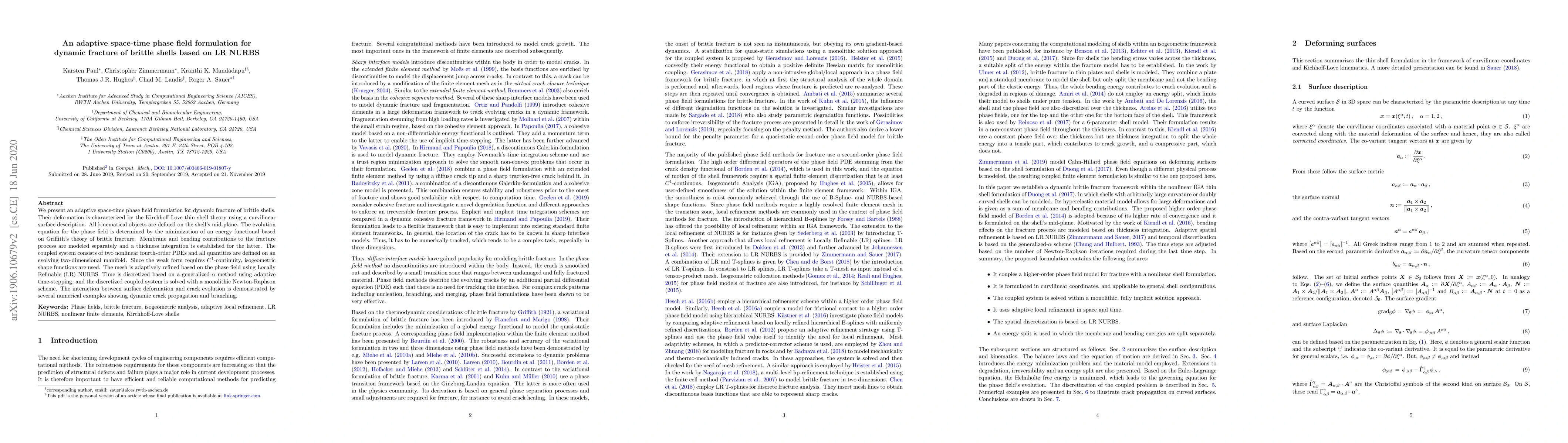 This paper introduces an adaptive space-time phase field formulation for dynamic fracture in brittle shells, employing Kirchhoff-Love thin shell theory and LR NURBS for mesh refinement. The fracture process is modeled by minimizing an energy functional based on Griffith's theory, with separate membrane and bending contributions, and solved using a monolithic Newton-Raphson scheme.