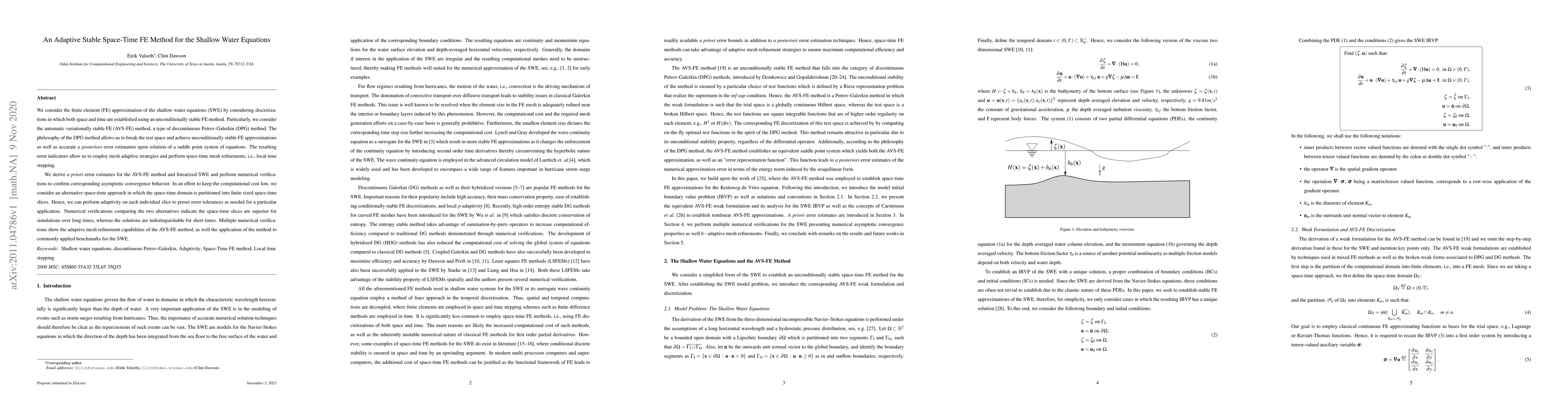 We consider the finite element (FE) approximation of the shallow water equations (SWE) by considering discretizations in which both space and time are established using an unconditionally stable FE method. Particularly, we consider the automatic variationally stable FE (AVS-FE) method, a type of discontinuous Petrov-Galerkin (DPG) method. The philosophy of the DPG method allows us to break the test space and achieve unconditionally stable FE approximations as well as accurate a posteriori error estimators upon solution of a saddle point system of equations. The resulting error indicators allow us to employ mesh adaptive strategies and perform space-time mesh refinements, i.e., local time stepping. We derive a priori error estimates for the AVS-FE method and linearized SWE and perform numerical verifications to confirm corresponding asymptotic convergence behavior. In an effort to keep the computational cost low, we consider an alternative space-time approach in which the space-time domain is partitioned into finite sized space-time slices. Hence, we can perform adaptivity on each individual slice to preset error tolerances as needed for a particular application. Numerical verifications comparing the two alternatives indicate the space-time slices are superior for simulations over long times, whereas the solutions are indistinguishable for short times. Multiple numerical verifications show the adaptive mesh refinement capabilities of the AVS-FE method, as well the application of the method to commonly applied benchmarks for the SWE.