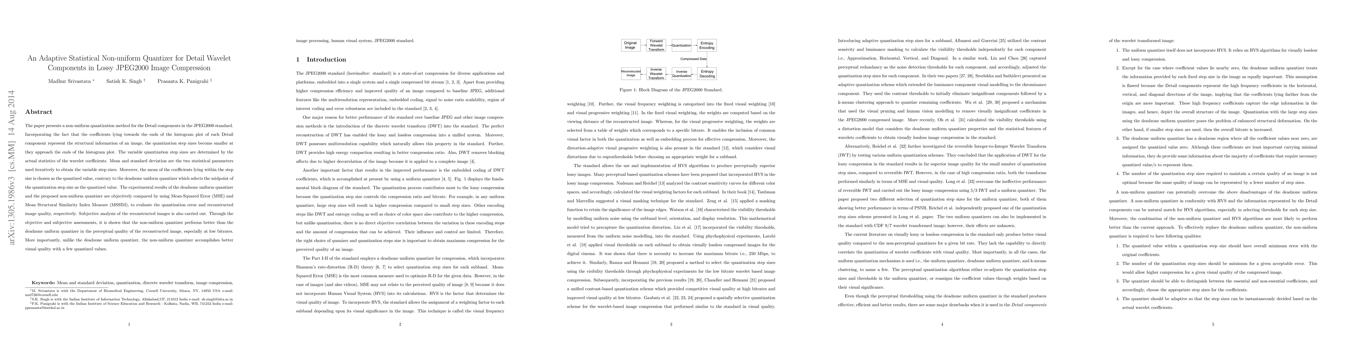 This paper introduces an adaptive statistical non-uniform quantizer for JPEG2000's Detail components, utilizing histogram statistics to reduce quantization step sizes near histogram ends. Compared to a deadzone uniform quantizer, the proposed method demonstrates improved perceptual image quality, especially at low bitrates, as proven by objective (MSE, MSSIM) and subjective assessments.