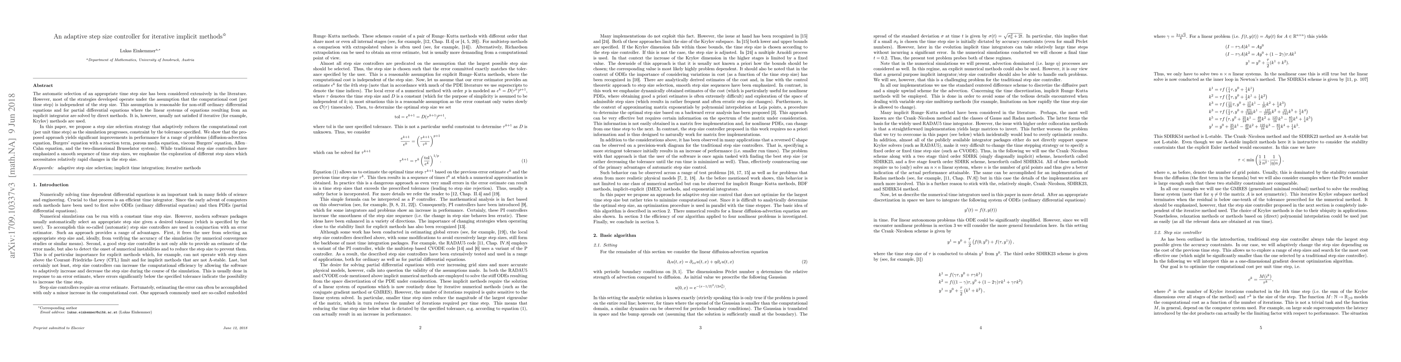 This paper proposes an adaptive step size controller for iterative implicit methods that reduces computational cost per time step as simulations progress, improving performance for various equations. Unlike traditional controllers, it allows rapid changes in step size to explore different sizes, yielding significant improvements.