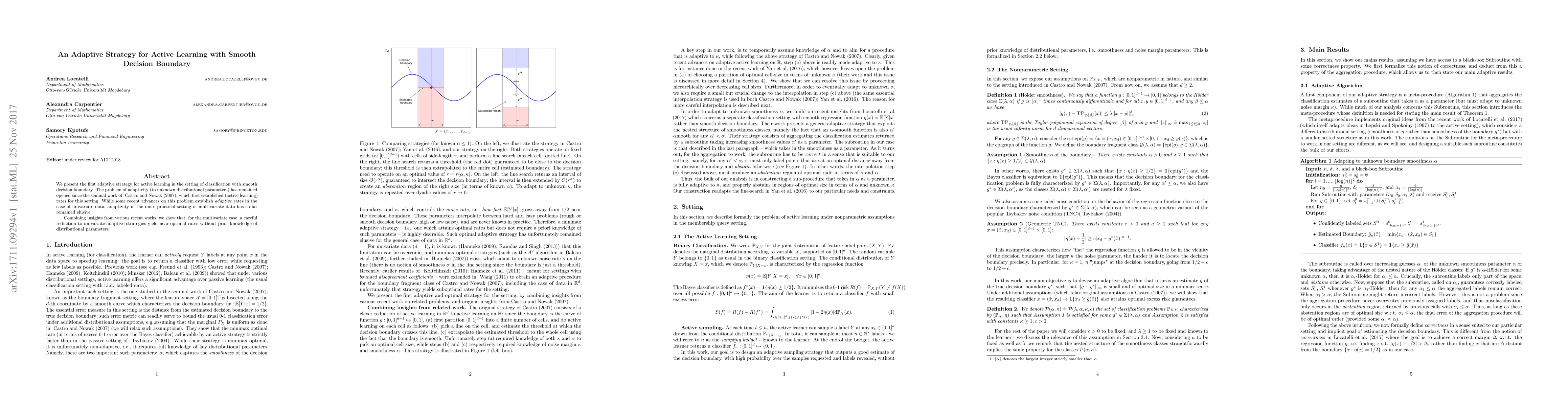 This paper introduces an adaptive strategy for active learning in classification tasks with smooth decision boundaries, addressing the longstanding challenge of adaptivity to unknown distributional parameters. It leverages insights from recent advances to achieve near-optimal rates for multivariate data without prior knowledge of these parameters.