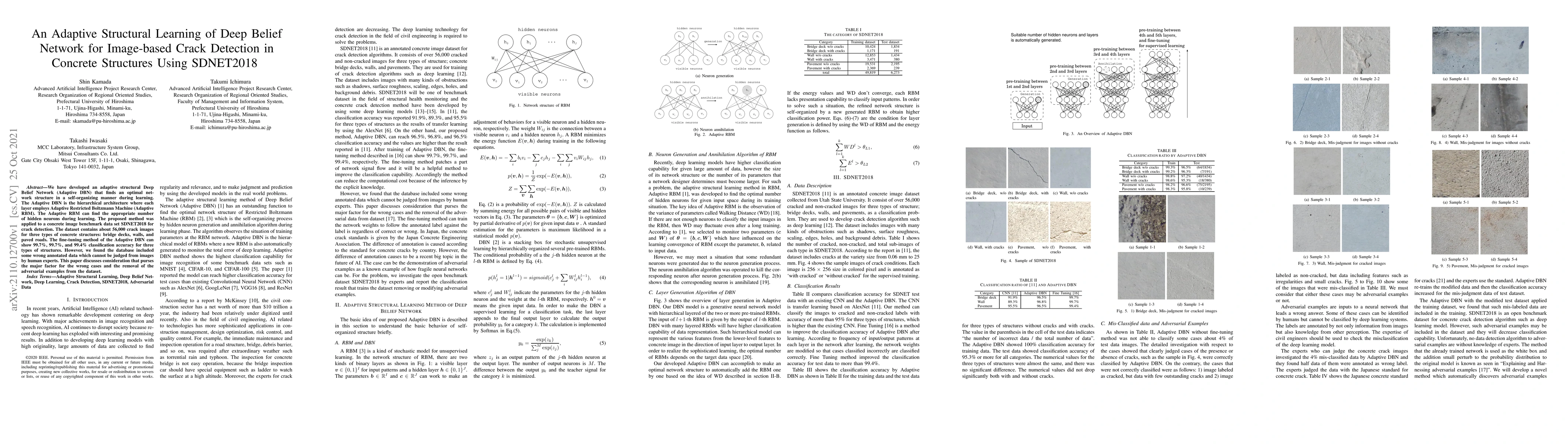 We have developed an adaptive structural Deep Belief Network (Adaptive DBN) that finds an optimal network structure in a self-organizing manner during learning. The Adaptive DBN is the hierarchical architecture where each layer employs Adaptive Restricted Boltzmann Machine (Adaptive RBM). The Adaptive RBM can find the appropriate number of hidden neurons during learning. The proposed method was applied to a concrete image benchmark data set SDNET2018 for crack detection. The dataset contains about 56,000 crack images for three types of concrete structures: bridge decks, walls, and paved roads. The fine-tuning method of the Adaptive DBN can show 99.7%, 99.7%, and 99.4% classification accuracy for three types of structures. However, we found the database included some wrong annotated data which cannot be judged from images by human experts. This paper discusses consideration that purses the major factor for the wrong cases and the removal of the adversarial examples from the dataset.