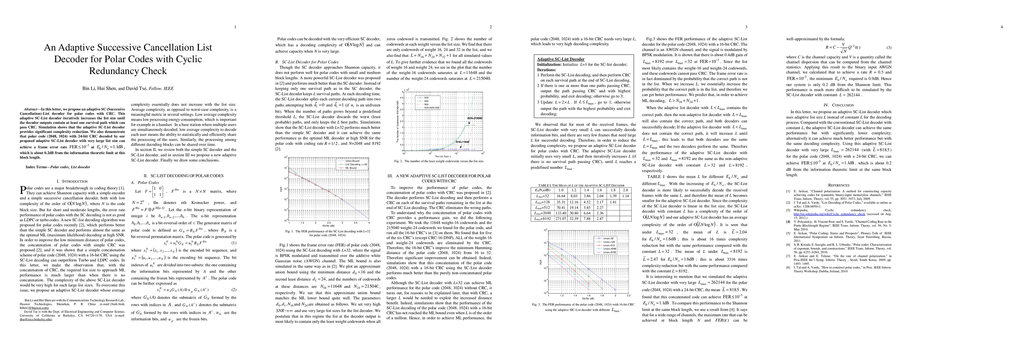 This paper proposes an adaptive Successive Cancellation List (SC-List) decoder for polar codes incorporating a Cyclic Redundancy Check (CRC), which iteratively increases list size until a valid path passing CRC is found, achieving significant complexity reduction and a near-optimal frame error rate of FER=0.001 at Eb/No=1.1dB.