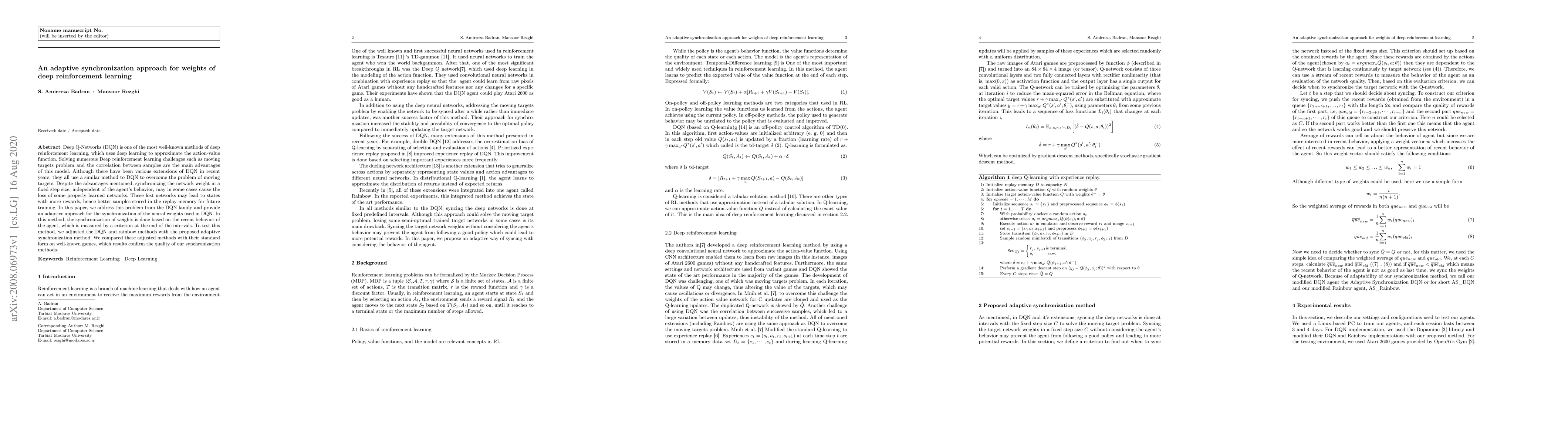 This paper proposes an adaptive synchronization approach for deep reinforcement learning models, allowing for more efficient weight updates based on recent agent behavior, improving overall performance in well-known games.