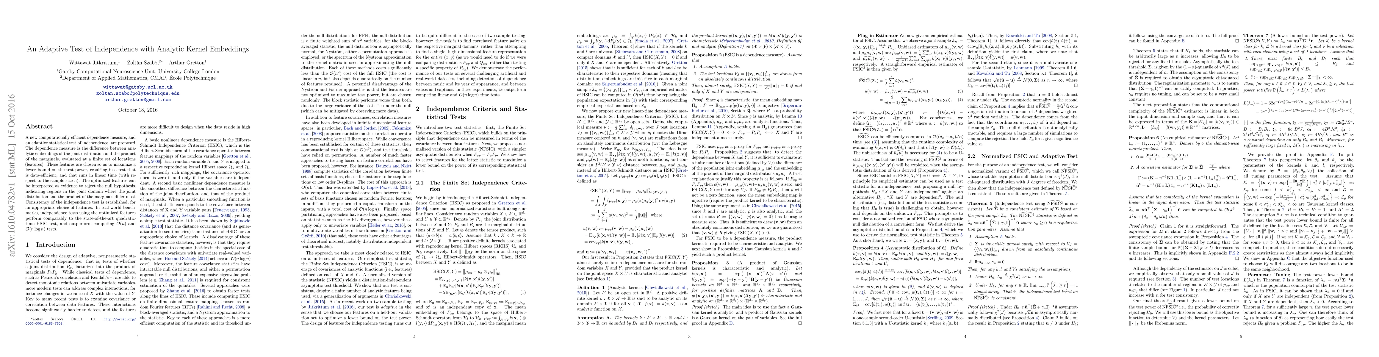 This paper proposes an adaptive statistical test of independence using analytic kernel embeddings, which selects features to maximize test power and runs in linear time. The optimized features indicate regions where joint and marginal distributions differ most, and the test performs competitively against state-of-the-art methods.