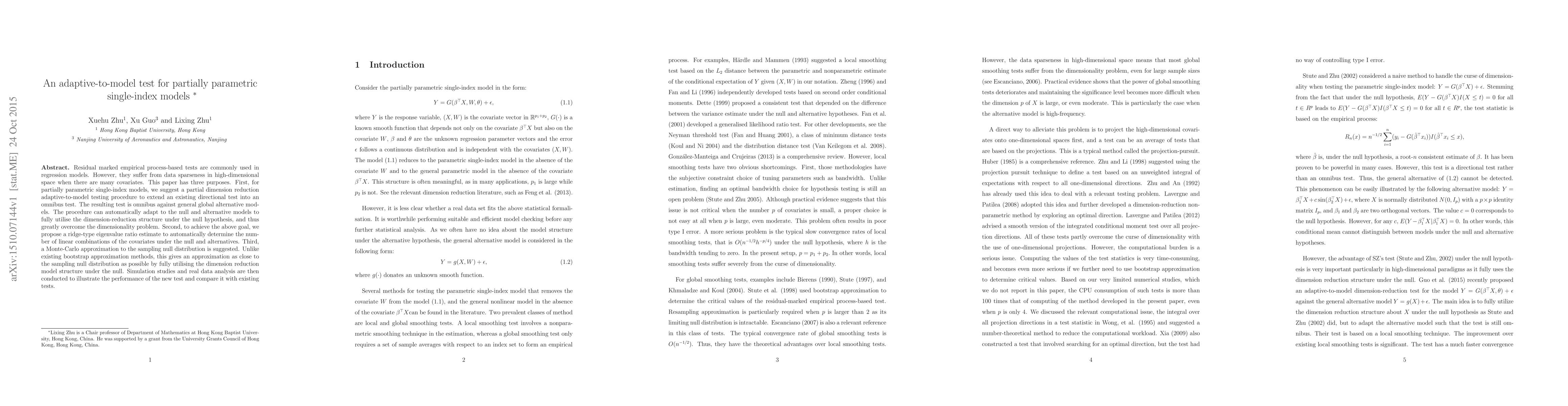 Residual marked empirical process-based tests are commonly used in regression models. However, they suffer from data sparseness in high-dimensional space when there are many covariates. This paper has three purposes. First, we suggest a partial dimension reduction adaptive-to-model testing procedure that can be omnibus against general global alternative models although it fully use the dimension reduction structure under the null hypothesis. This feature is because that the procedure can automatically adapt to the null and alternative models, and thus greatly overcomes the dimensionality problem. Second, to achieve the above goal, we propose a ridge-type eigenvalue ratio estimate to automatically determine the number of linear combinations of the covariates under the null and alternatives. Third, a Monte-Carlo approximation to the sampling null distribution is suggested. Unlike existing bootstrap approximation methods, this gives an approximation as close to the sampling null distribution as possible by fully utilising the dimension reduction model structure under the null. Simulation studies and real data analysis are then conducted to illustrate the performance of the new test and compare it with existing tests.
