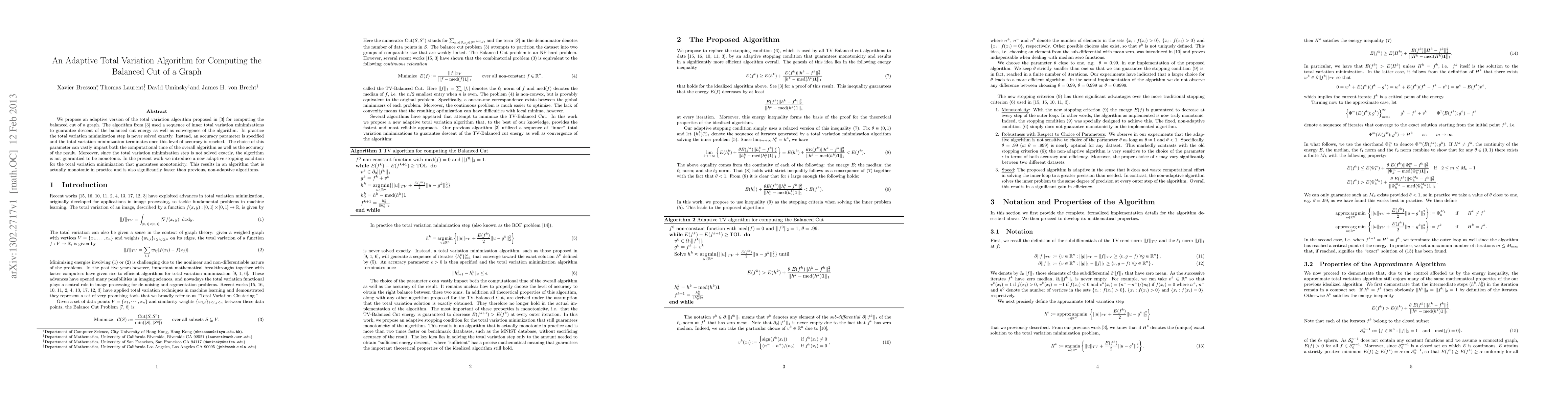 We propose an adaptive version of the total variation algorithm proposed in [3] for computing the balanced cut of a graph. The algorithm from [3] used a sequence of inner total variation minimizations to guarantee descent of the balanced cut energy as well as convergence of the algorithm. In practice the total variation minimization step is never solved exactly. Instead, an accuracy parameter is specified and the total variation minimization terminates once this level of accuracy is reached. The choice of this parameter can vastly impact both the computational time of the overall algorithm as well as the accuracy of the result. Moreover, since the total variation minimization step is not solved exactly, the algorithm is not guarantied to be monotonic. In the present work we introduce a new adaptive stopping condition for the total variation minimization that guarantees monotonicity. This results in an algorithm that is actually monotonic in practice and is also significantly faster than previous, non-adaptive algorithms.