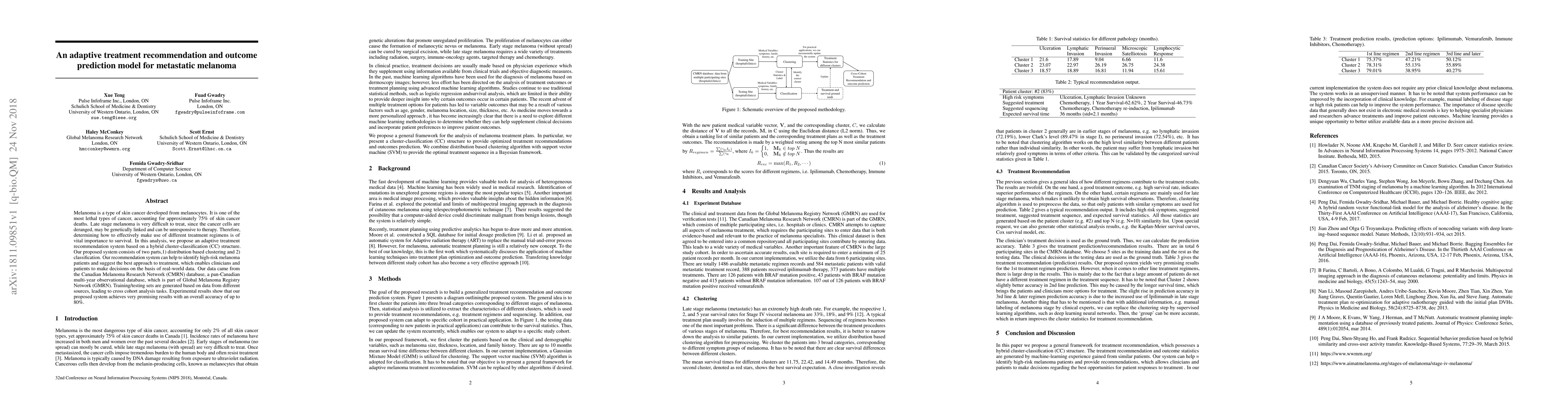 Melanoma is a type of skin cancer developed from melanocytes. It is one of the most lethal types of cancer, accounting for approximately 75% of skin cancer deaths. Late stage melanoma is very difficult to treat, since the cancer cells are deranged, may be genetically linked and can be unresponsive to therapy. Therefore, determining how to effectively make use of different treatment regimens is of vital importance to survival. In this analysis, we propose an adaptive treatment recommendation system based on a hybrid cluster-classification (CC) structure. Our proposed system consists of two parts,1) distribution based clustering and 2) classification. Our recommendation system can help to identify high-risk melanoma patients and suggest the best approach to treatment, which enables clinicians and patients to make decisions on the basis of real-world data. Our data came from the Canadian Melanoma Research Network (CMRN) database, a pan-Canadian multi-year observational database, which is part of Global Melanoma Registry Network (GMRN). Training/testing sets are generated based on data from different sources, leading to cross cohort analysis tasks. Experimental results show that our proposed system achieves very promising results with an overall accuracy of up to 80%.