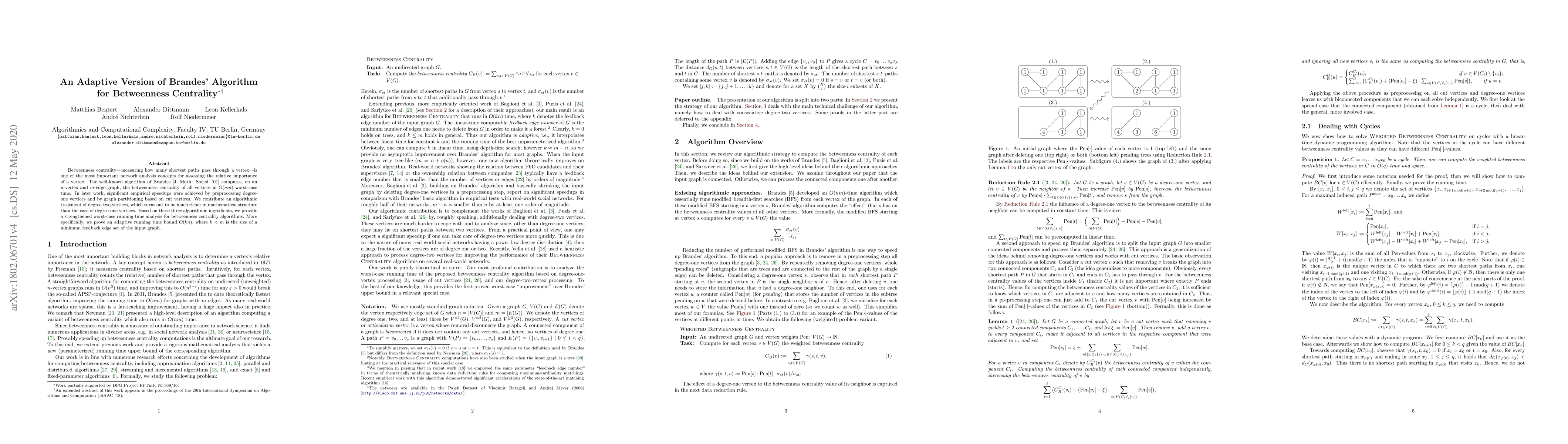 A new algorithm for measuring betweenness centrality in networks offers improved performance by targeting degree-two vertices, resulting in an adaptive running time of O(kn), where k is the size of a minimum feedback edge set.