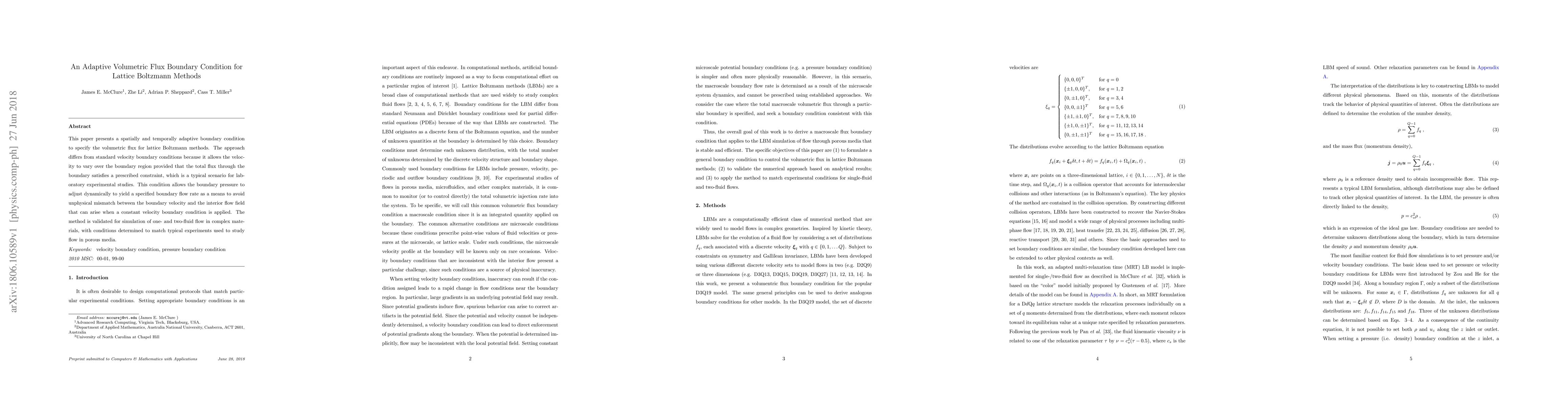 This paper introduces an adaptive volumetric flux boundary condition for lattice Boltzmann methods, allowing boundary velocity variation while maintaining a specified total flux, thus avoiding mismatches between boundary and interior flow fields. The method is validated for simulating one- and two-fluid flows in complex materials.