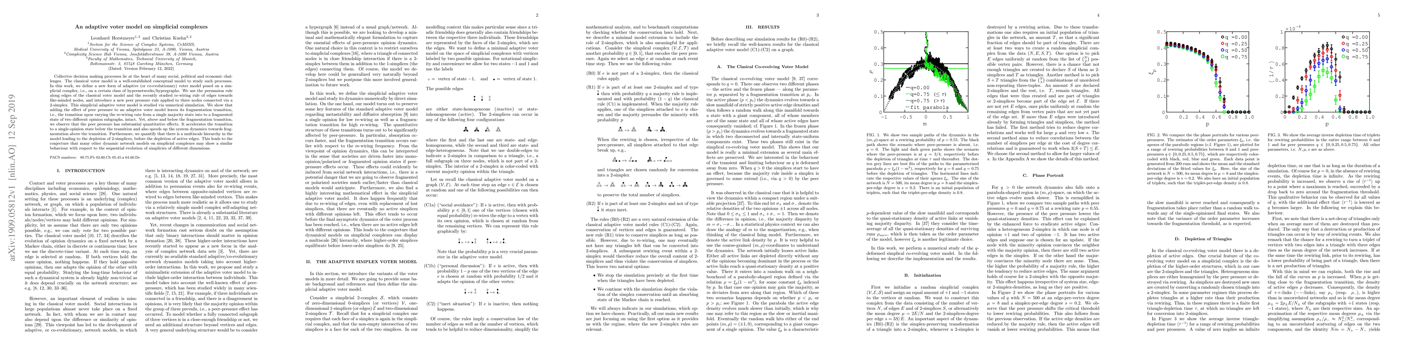 Collective decision making processes lie at the heart of many social, political and economic challenges. The classical voter model is a well-established conceptual model to study such processes. In this work, we define a new form of adaptive (or co-evolutionary) voter model posed on a simplicial complex, i.e., on a certain class of hypernetworks/hypergraphs. We use the persuasion rule along edges of the classical voter model and the recently studied re-wiring rule of edges towards like-minded nodes, and introduce a new peer pressure rule applied to three nodes connected via a 2-simplex. This simplicial adaptive voter model is studied via numerical simulation. We show that adding the effect of peer pressure to an adaptive voter model leaves its fragmentation transition, i.e., the transition upon varying the re-wiring rate from a single majority state into to a fragmented state of two different opinion subgraphs, intact. Yet, above and below the fragmentation transition, we observe that the peer pressure has substantial quantitative effects. It accelerates the transition to a single-opinion state below the transition and also speeds up the system dynamics towards fragmentation above the transition. Furthermore, we quantify that there is a multiscale hierarchy in the model leading to the depletion of 2-simplices, before the depletion of active edges. This leads to the conjecture that many other dynamic network models on simplicial complexes may show a similar behaviour with respect to the sequential evolution of simplicies of different dimensions.