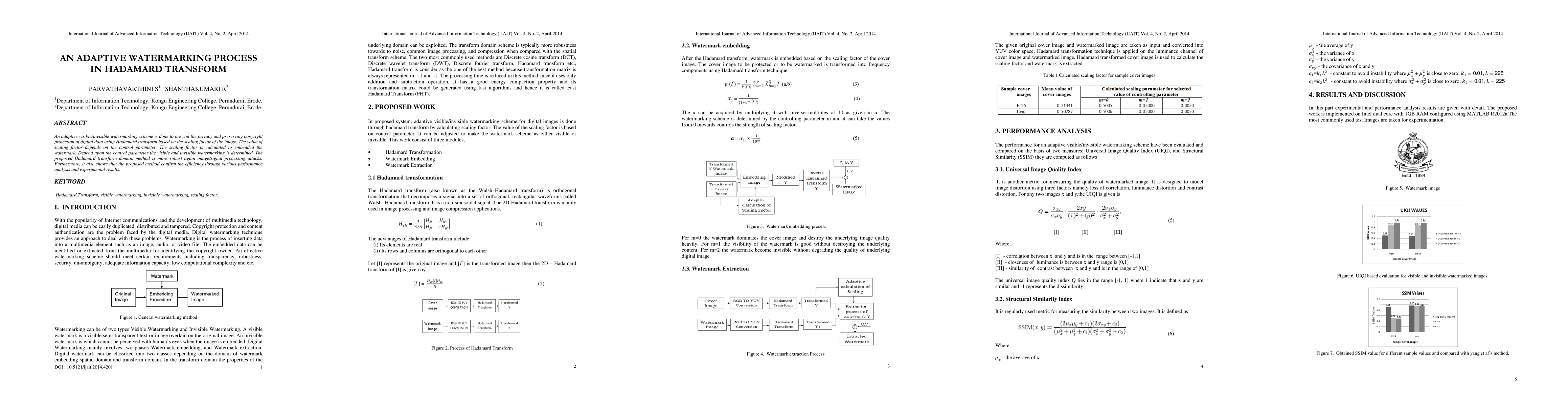 An adaptive visible/invisible watermarking scheme is done to prevent the privacy and preserving copyright protection of digital data using Hadamard transform based on the scaling factor of the image. The value of scaling factor depends on the control parameter. The scaling factor is calculated to embedded the watermark. Depend upon the control parameter the visible and invisible watermarking is determined. The proposed Hadamard transform domain method is more robust again image/signal processing attacks. Furthermore, it also shows that the proposed method confirm the efficiency through various performance analysis and experimental results.
