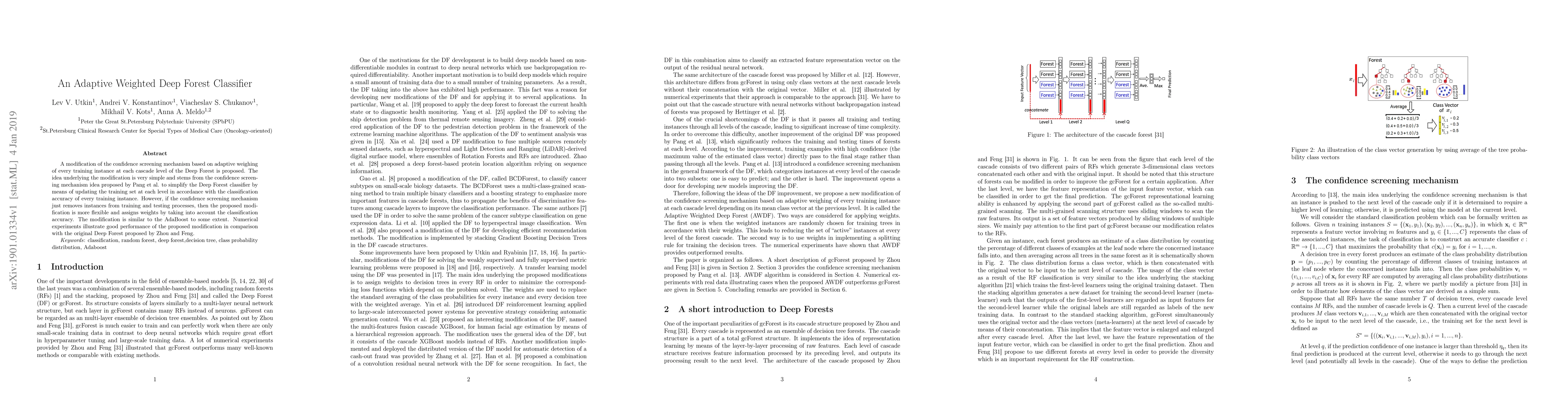 The paper proposes an adaptive weighted Deep Forest classifier that modifies the confidence screening mechanism by assigning weights based on classification accuracy, improving performance over the original Deep Forest classifier. Numerical experiments demonstrate superior results compared to the standard Deep Forest model.