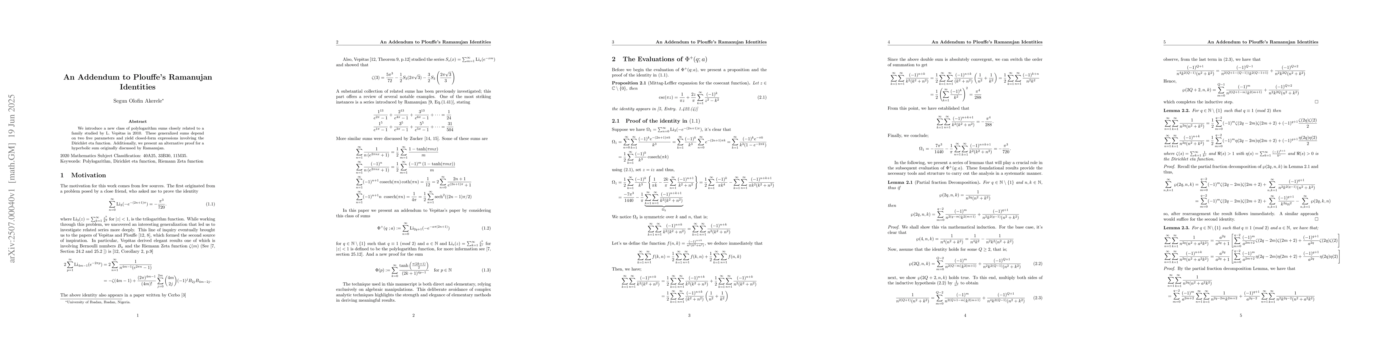 We introduce a new class of polylogarithm sums closely related to a family studied by L. Vep\v{s}tas in 2010. These generalized sums depend on two free parameters and yield closed-form expressions involving the Dirichlet eta function. Additionally, we present an alternative proof for a hyperbolic sum originally discussed by Ramanujan.