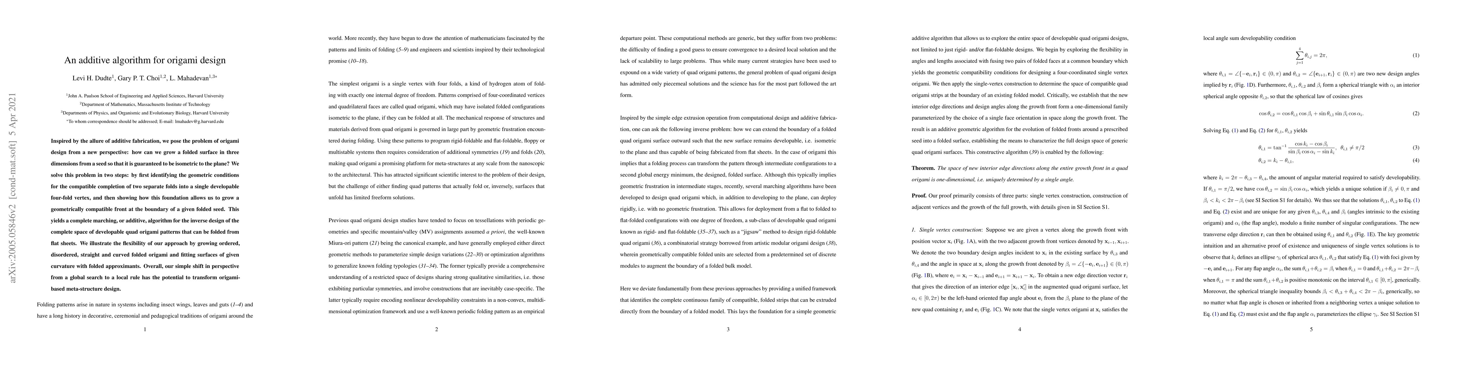 Inspired by the allure of additive fabrication, we pose the problem of origami design from a new perspective: how can we grow a folded surface in three dimensions from a seed so that it is guaranteed to be isometric to the plane? We solve this problem in two steps: by first identifying the geometric conditions for the compatible completion of two separate folds into a single developable four-fold vertex, and then showing how this foundation allows us to grow a geometrically compatible front at the boundary of a given folded seed. This yields a complete marching, or additive, algorithm for the inverse design of the complete space of developable quad origami patterns that can be folded from flat sheets. We illustrate the flexibility of our approach by growing ordered, disordered, straight and curved folded origami and fitting surfaces of given curvature with folded approximants. Overall, our simple shift in perspective from a global search to a local rule has the potential to transform origami-based meta-structure design.