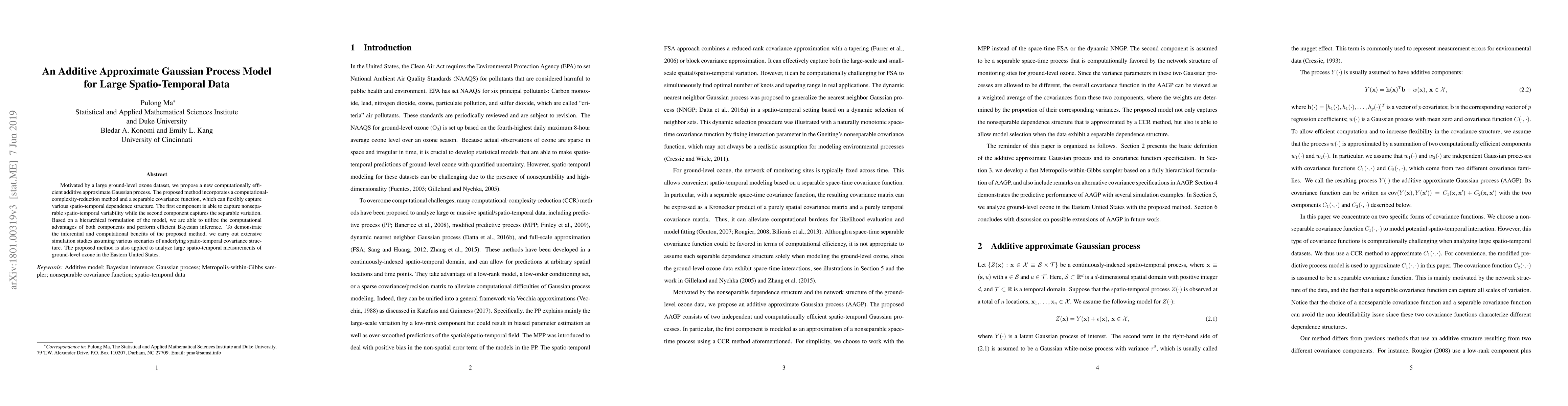 This paper proposes a computationally efficient additive approximate Gaussian process model for large spatio-temporal data, incorporating a complexity-reduction method and a separable covariance function to capture both nonseparable and separable variations. The method enables efficient Bayesian inference and is demonstrated through simulations and an application to ground-level ozone data in the Eastern United States.