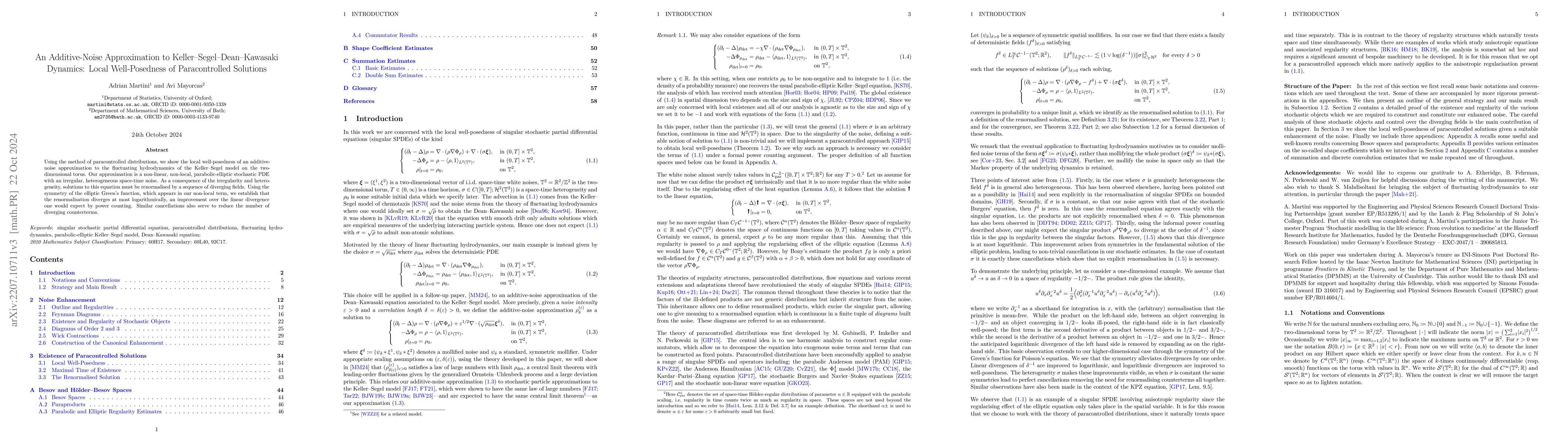 Using the method of paracontrolled distributions, we show the local well-posedness of an additive noise approximation to the fluctuating hydrodynamics of the Keller-Segel model on the two-dimensional torus. Our approximation is a non-linear, non-local, parabolic-elliptic stochastic PDE with an irregular, heterogeneous space-time noise. As a consequence of the irregularity and heterogeneity, solutions to this equation must be renormalised by a sequence of diverging fields. Using the symmetry of the elliptic Green's function, which appears in our non-local term, we establish that the renormalisation diverges at most logarithmically, an improvement over the linear divergence one would expect by power counting. Similar cancellations also serve to reduce the number of diverging counterterms.