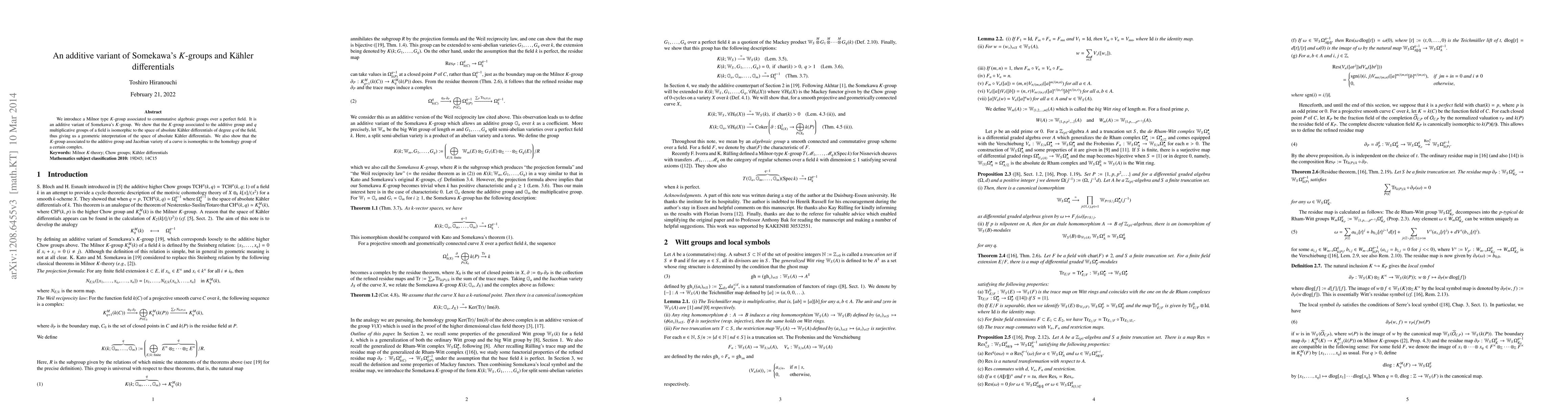 We introduce a Milnor type $K$-group associated to commutative algebraic groups over a perfect field. It is an additive variant of Somekawa's $K$-group. We show that the $K$-group associated to the additive group and $q$ multiplicative groups of a field is isomorphic to the space of absolute K\"ahler differentials of degree $q$ of the field, thus giving us a geometric interpretation of the space of absolute K\"ahler differentials. We also show that the $K$-group associated to the additive group and Jacobian variety of a curve is isomorphic to the homology group of a certain complex.