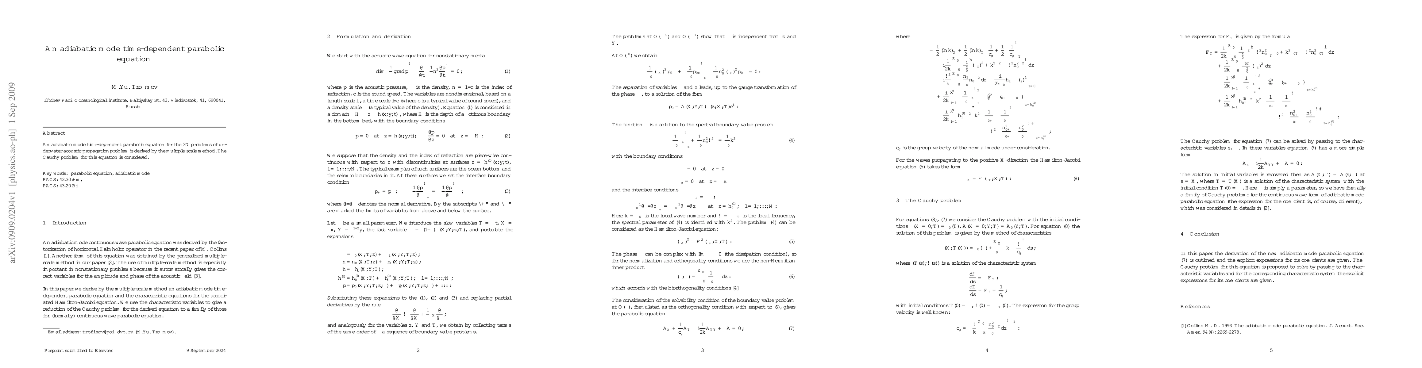 Summary: This paper derives an adiabatic mode time-dependent parabolic equation for 3D underwater acoustic propagation using the multiple-scale method, and examines the Cauchy problem for this equation.