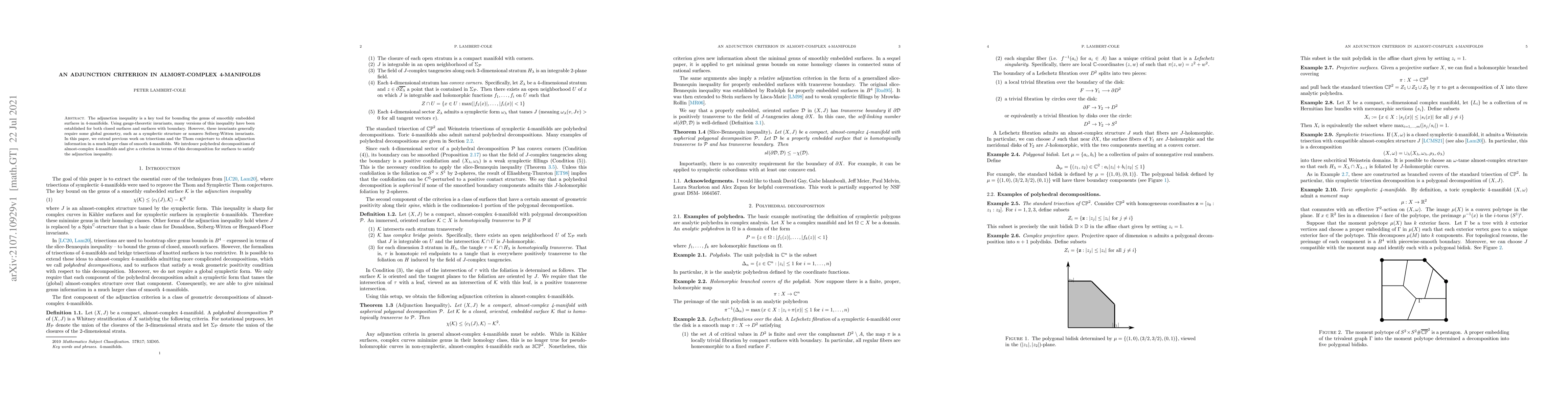 This paper extends adjunction inequalities for smoothly embedded surfaces in 4-manifolds by introducing polyhedral decompositions of almost-complex 4-manifolds, thereby broadening the applicability beyond those requiring global geometry like symplectic structures. A new criterion is provided for surfaces to satisfy the adjunction inequality based on these decompositions.