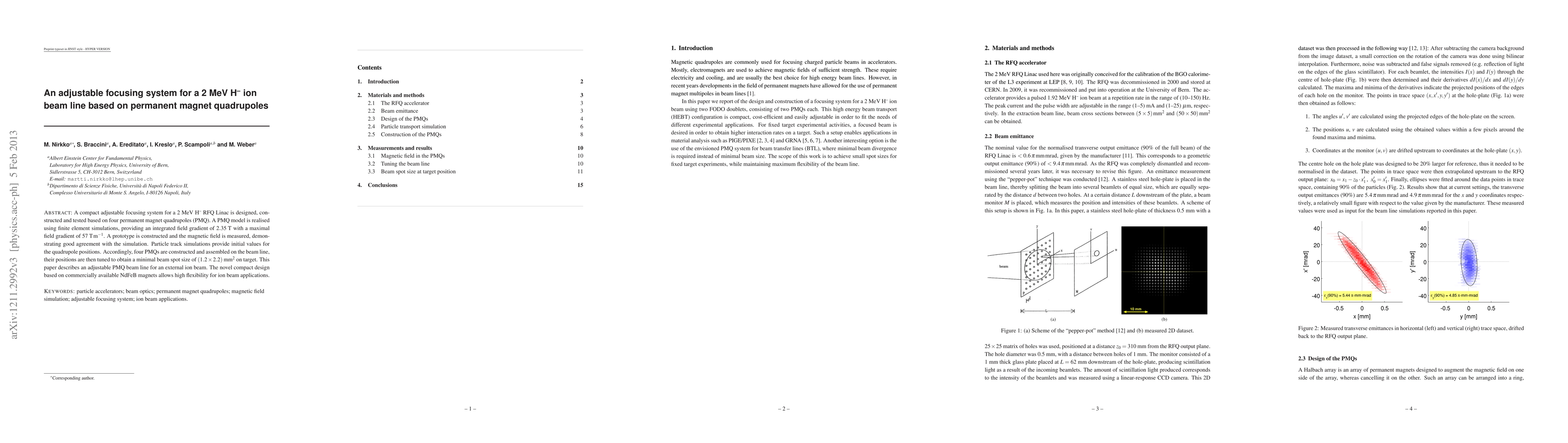 Researchers designed a compact adjustable focusing system for a 2 MeV H- ion beam line using permanent magnet quadrupoles, achieving a minimal beam spot size of (1.2 x 2.2) mm^2 on target.