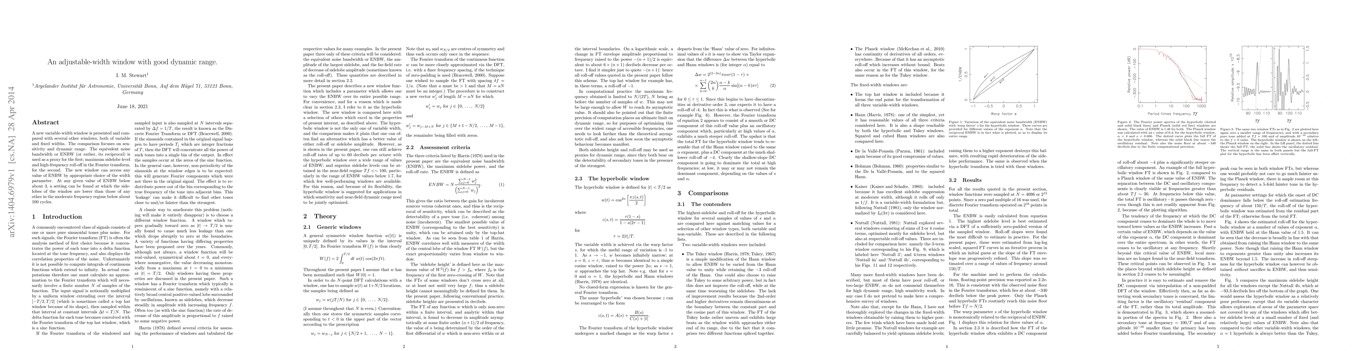 A new variable-width window is presented and compared with several other windows, both of variable and fixed widths. The comparison focuses on sensitivity and dynamic range. The equivalent noise bandwidth or ENBW (or rather, its reciprocal) is used as a proxy for the first; maximum sidelobe level and high-frequency roll-off in the Fourier transform, for the second. The new window can access any value of ENBW by appropriate choice of the width parameter. At any given value of ENBW below about 3, a setting can be found at which the sidelobes of the window are lower than those of any other in the moderate frequency regime below about 100 cycles.