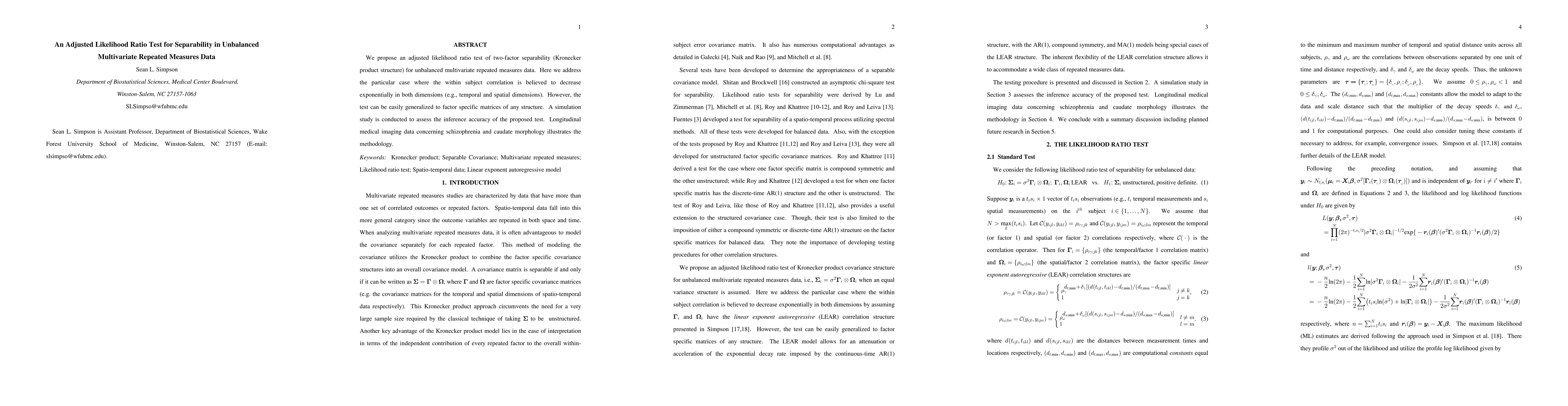 This paper proposes an adjusted likelihood ratio test to assess two-factor separability in unbalanced multivariate repeated measures data, particularly for cases where within-subject correlation decreases exponentially. The test is demonstrated through a simulation study and applied to longitudinal medical imaging data on schizophrenia and caudate morphology.