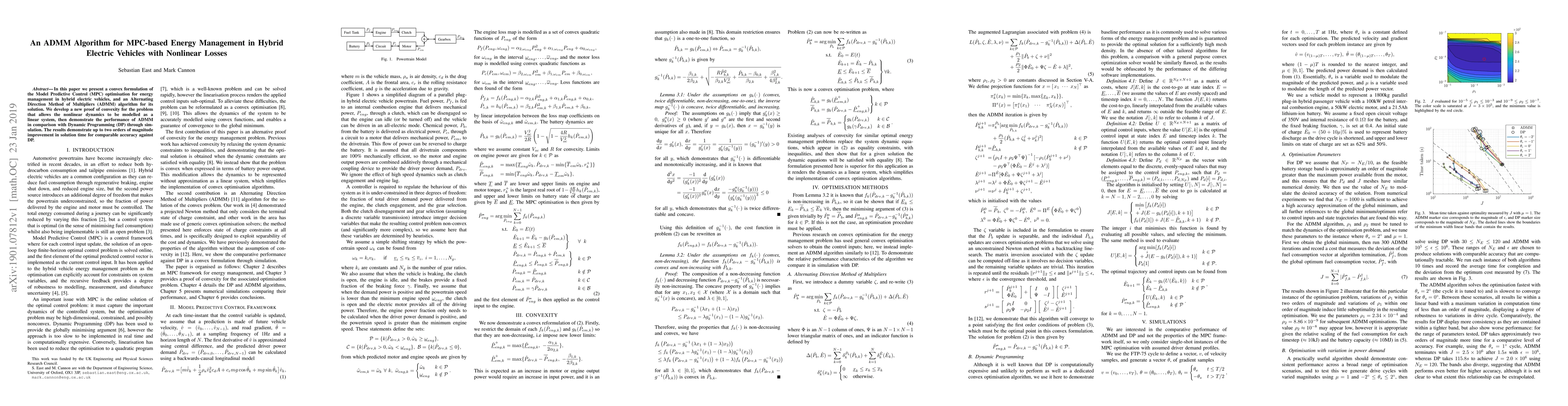 This paper proposes a convex MPC optimization algorithm for energy management in hybrid electric vehicles using an ADMM solver, proving the problem's convexity to model nonlinear dynamics linearly. Simulation results show ADMM significantly reduces solution time compared to Dynamic Programming while maintaining accuracy.