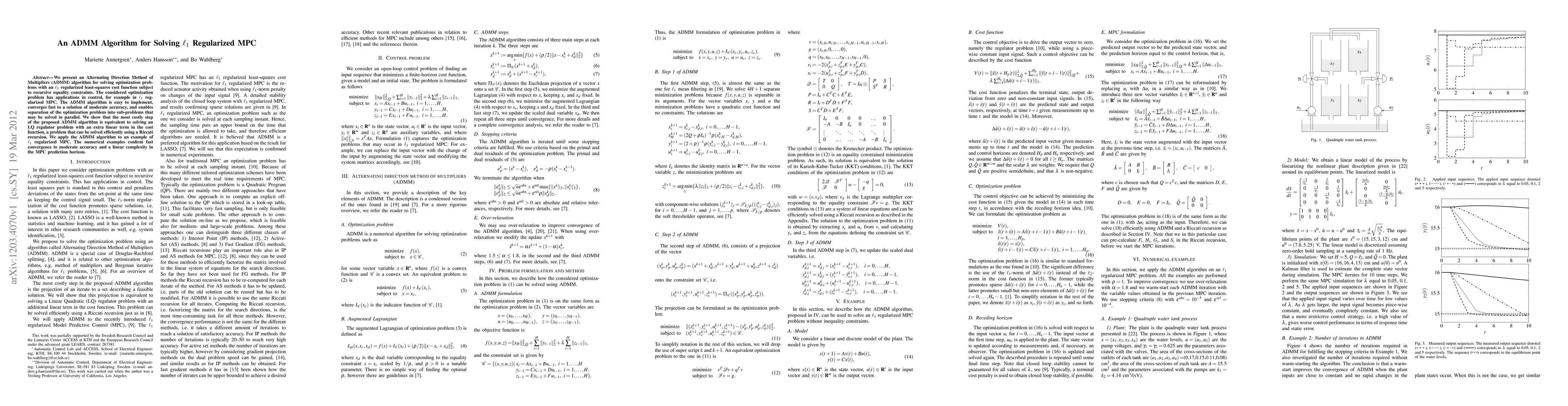 We present an Alternating Direction Method of Multipliers (ADMM) algorithm for solving optimization problems with an l_1 regularized least-squares cost function subject to recursive equality constraints. The considered optimization problem has applications in control, for example in l_1 regularized MPC. The ADMM algorithm is easy to implement, converges fast to a solution of moderate accuracy, and enables separation of the optimization problem into sub-problems that may be solved in parallel. We show that the most costly step of the proposed ADMM algorithm is equivalent to solving an LQ regulator problem with an extra linear term in the cost function, a problem that can be solved efficiently using a Riccati recursion. We apply the ADMM algorithm to an example of l_1 regularized MPC. The numerical examples confirm fast convergence to moderate accuracy and a linear complexity in the MPC prediction horizon.