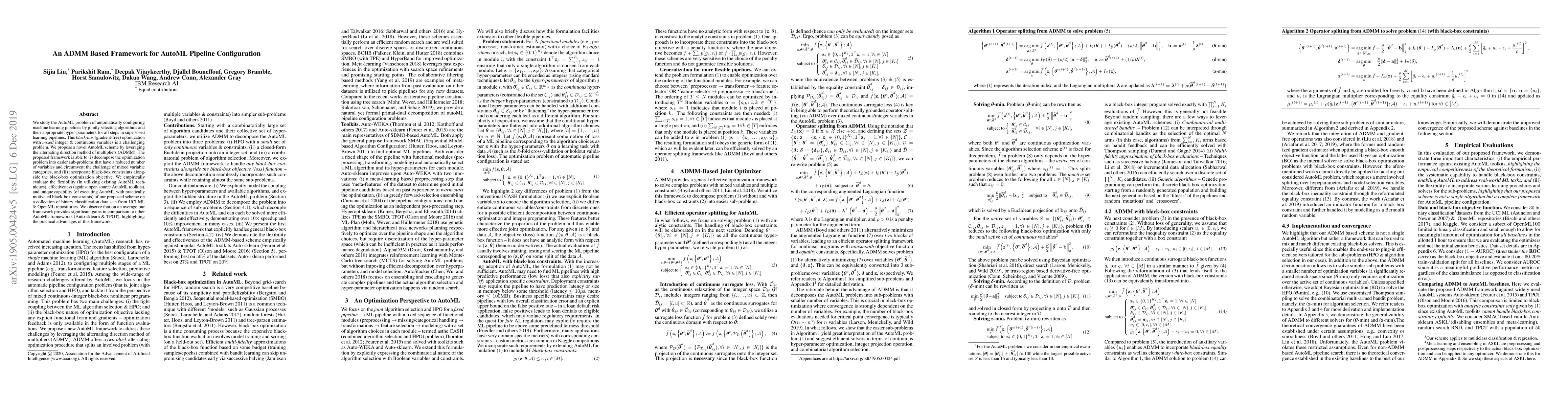 This paper proposes an ADMM-based framework for configuring AutoML pipelines by optimizing both algorithms and hyperparameters. The framework decomposes the complex optimization problem into manageable sub-problems and effectively handles mixed variable types and black-box constraints, demonstrating superior performance compared to existing AutoML tools.