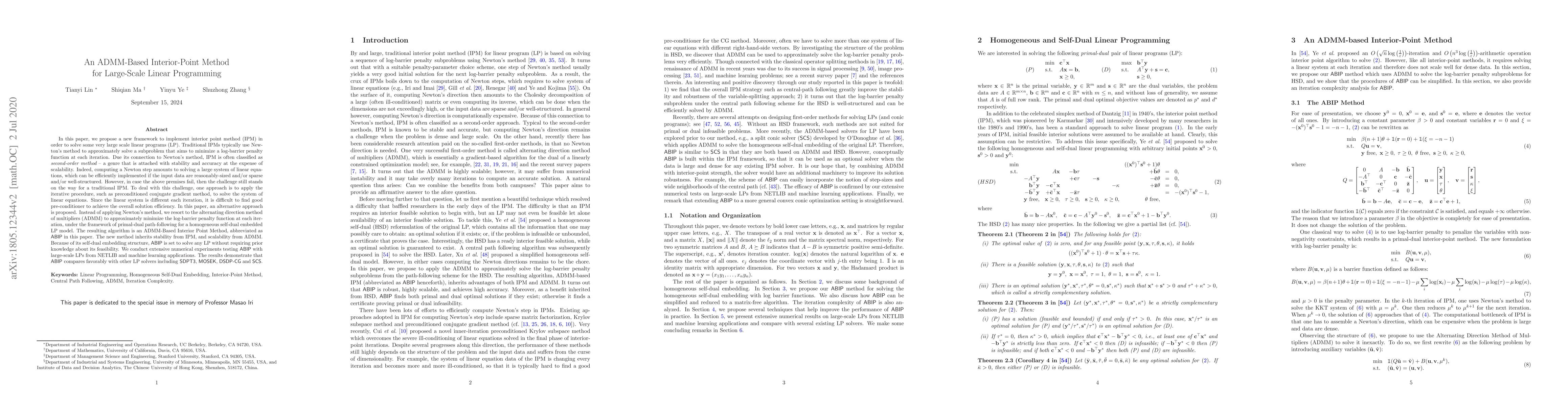This paper proposes an ADMM-Based Interior Point Method (ABIP) to solve large-scale linear programs, combining the stability of interior point methods with the scalability of ADMM to efficiently handle large linear systems without requiring prior knowledge of problem feasibility. Numerical experiments show ABIP's competitive performance against existing solvers.