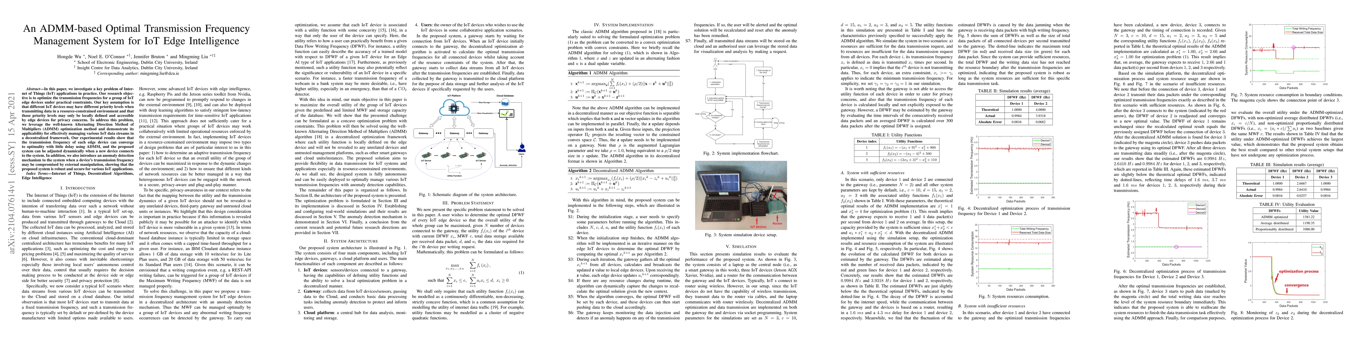 This paper proposes an ADMM-based system for optimal transmission frequency management in IoT edge devices, optimizing frequencies under local priority levels and practical constraints. Experimental results show effective convergence to optimal frequencies and dynamic adaptability, along with a robust anomaly detection mechanism for security.