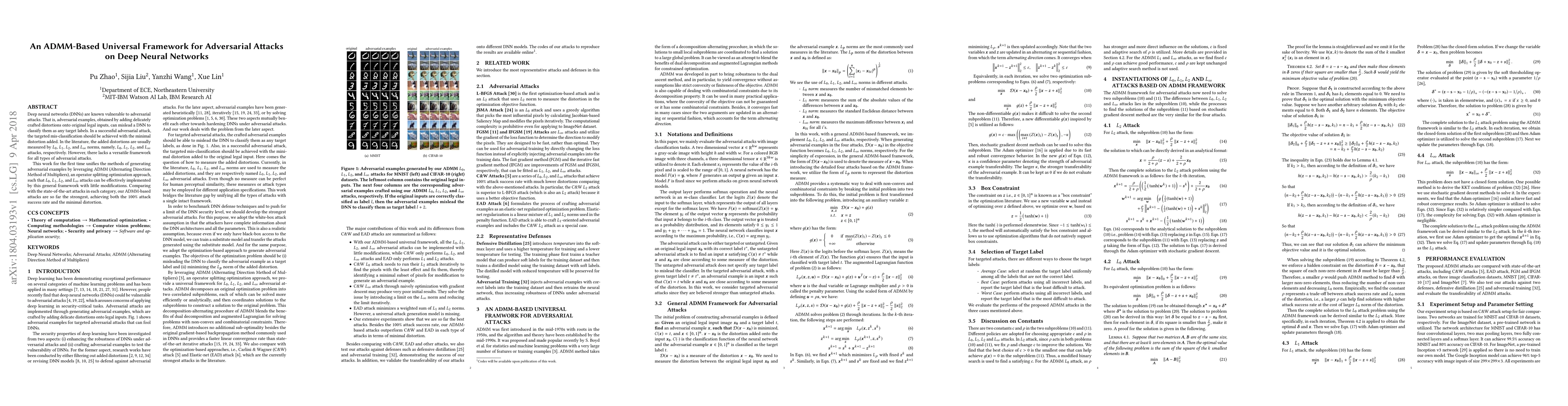 This paper proposes an ADMM-based universal framework for adversarial attacks on deep neural networks, unifying L0, L1, L2, and L infinity attack methods. The ADMM approach enables effective implementation of all attack types with minimal modifications, achieving 100% success rate and minimal distortion compared to existing methods.