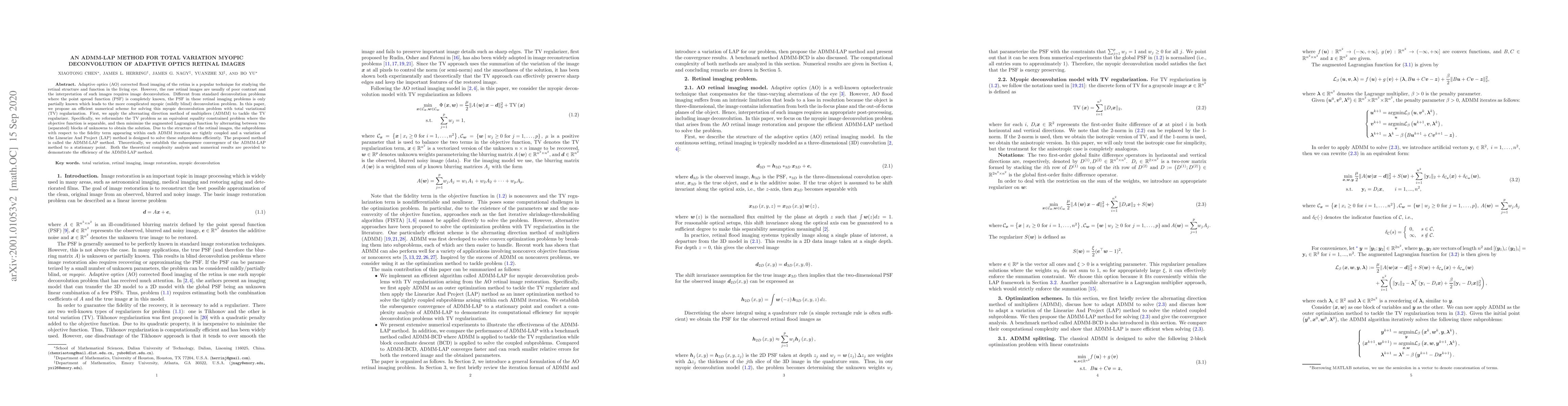 This paper proposes the ADMM-LAP method to solve total variation myopic deconvolution for adaptive optics retinal images where the point spread function is partially known. The method uses the alternating direction method of multipliers (ADMM) to handle the total variation regularization and a variation of the Linearize And Project (LAP) method to efficiently solve coupled subproblems, demonstrating convergence and efficiency.