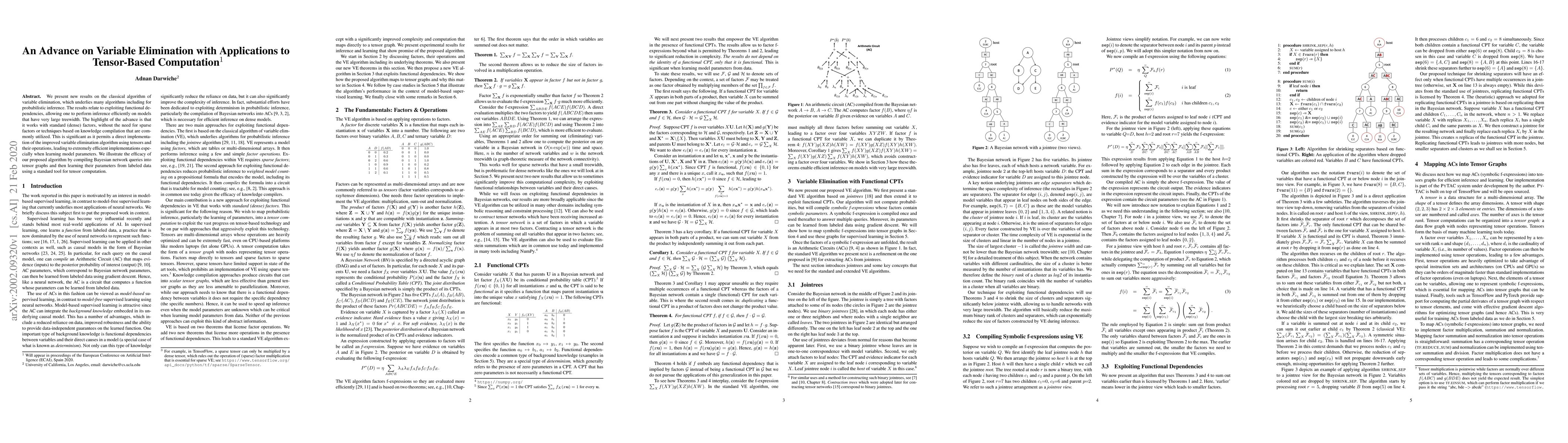 This paper introduces an advanced variable elimination algorithm that leverages functional dependencies for efficient inference and learning in models with large treewidth, using tensor operations for direct implementation without requiring sparse factors. The proposed method is shown to efficiently learn model parameters from labeled data by compiling Bayesian network queries into tensor graphs.