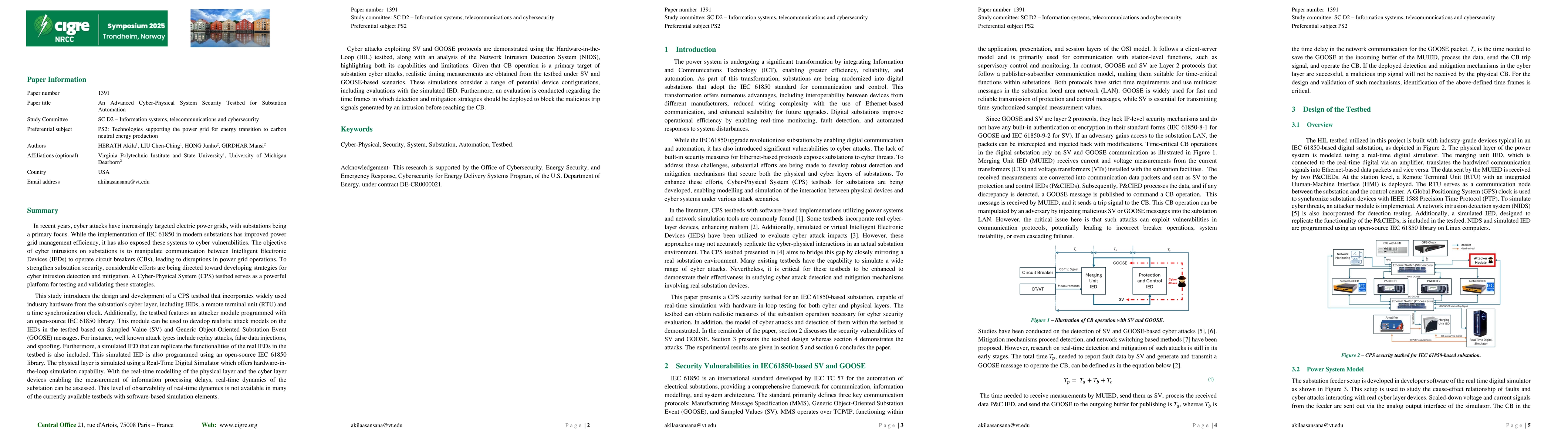 The research presents the design and development of a Cyber-Physical System (CPS) testbed for substation automation, focusing on real-time dynamics assessment and cyber intrusion detection strategy testing.