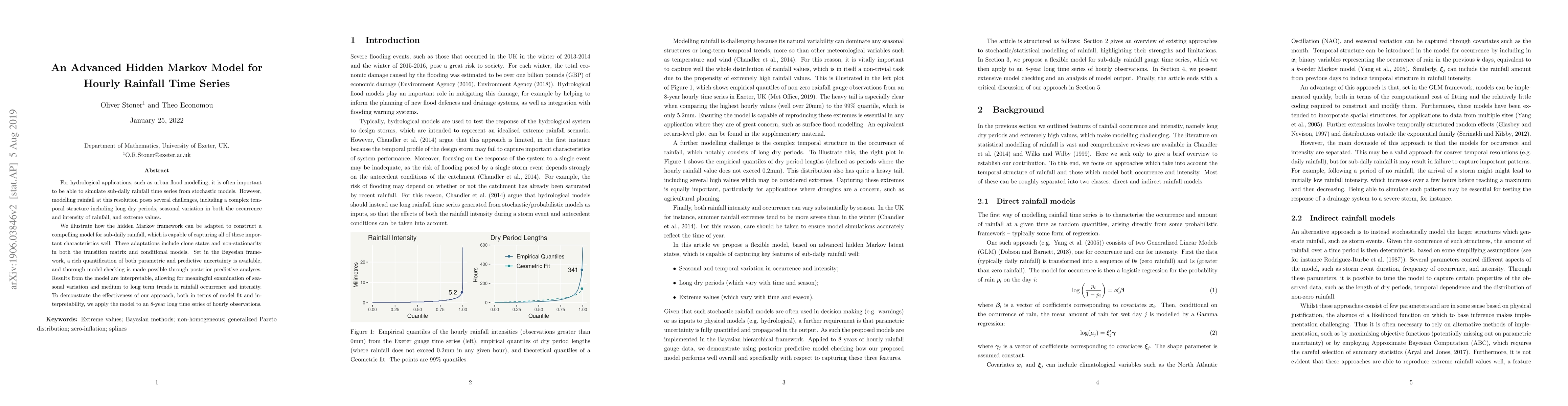 This paper proposes an advanced Hidden Markov Model to simulate sub-daily rainfall time series, addressing challenges like long dry periods and seasonal variations. The model incorporates clone states and non-stationary elements, enabling it to capture complex temporal structures and provide rich uncertainty quantification.