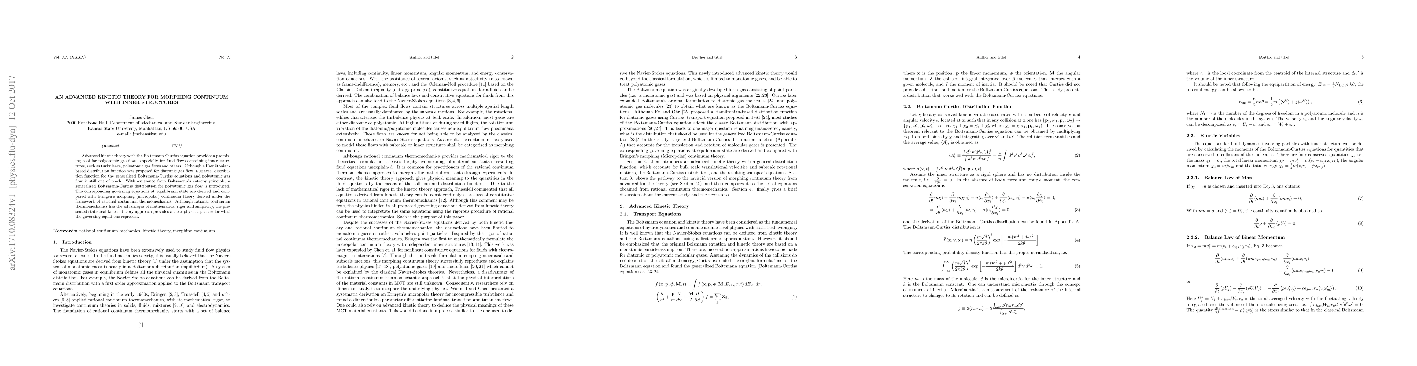 This paper introduces an advanced kinetic theory using the Boltzmann-Curtiss equation to develop a generalized distribution function for polyatomic gas flows, including inner structures like turbulence. It compares this new approach with Eringen's morphing continuum theory, highlighting the physical insights provided by the kinetic theory despite the mathematical rigor of continuum thermomechanics.