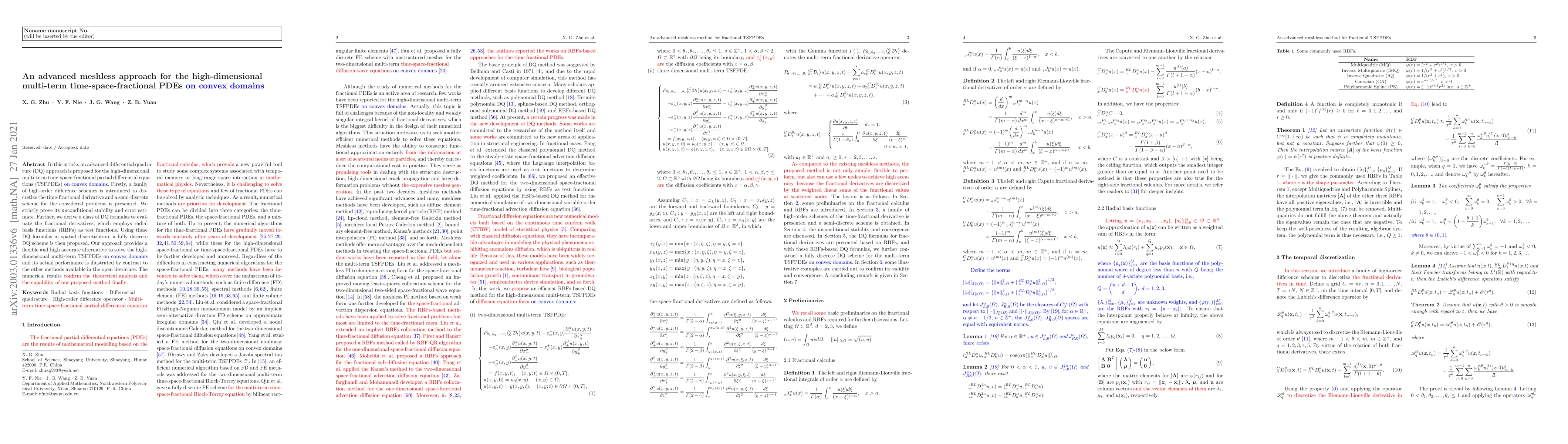 This research introduces an advanced Differential Quadrature (DQ) method for solving high-dimensional, multi-term time-space-fractional partial differential equations (TSFPDEs) on convex domains. The method involves high-order difference schemes for time-fractional derivatives, proven stable and accurate with error estimates. Radial basis functions (RBFs) are used to derive DQ formulas for fractional derivatives, leading to a flexible and precise fully discrete DQ scheme. Numerical results validate the approach's effectiveness compared to existing methods.