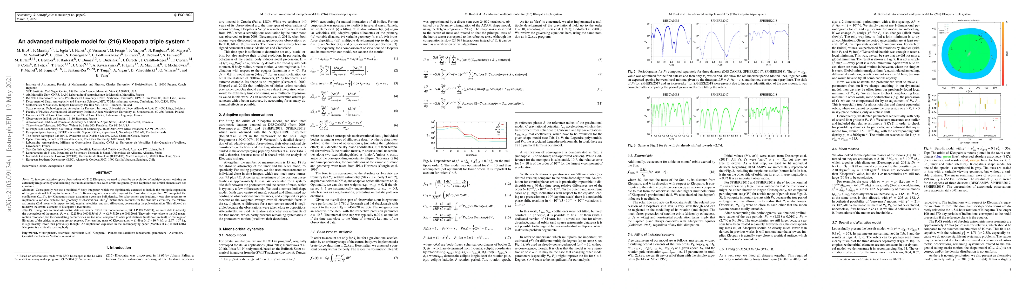 To interpret adaptive-optics observations of (216) Kleopatra, we need to describe an evolution of multiple moons, orbiting an extremely irregular body and including their mutual interactions. Such orbits are generally non-Keplerian and orbital elements are not constants. Consequently, we use a modified $N$-body integrator, which was significantly extended to include the multipole expansion of the gravitational field up to the order $\ell = 10$. Its convergence was verified against the `brute-force' algorithm. We computed the coefficients $C_{\ell m},S_{\!\ell m}$ for Kleopatra's shape, assuming a~constant bulk density. For solar-system applications, it was also necessary to implement a variable distance and geometry of observations. Our $\chi^2$ metric then accounts for the absolute astrometry, the relative astrometry (2nd moon with respect to 1st), angular velocities, and also silhouettes, constraining the pole orientation. This allowed us to derive the orbital elements of Kleopatra's two moons. Using both archival astrometric data and new VLT/SPHERE observations (ESO LP 199.C-0074), we were able to identify the true periods of the moons, $P_1 = (1.822359\pm0.004156)\,{\rm d}$, $P_2 = (2.745820\pm0.004820)\,{\rm d}$. They orbit very close to the 3:2 mean-motion resonance, but their osculating eccentricities are too small compared to other perturbations (multipole, mutual), so that regular librations of the critical argument are not present. The resulting mass of Kleopatra, $m_1 = (1.49\pm0.16)\cdot10^{-12}\,M_\odot$ or $2.97\cdot10^{18}\,{\rm kg}$, is significantly lower than previously thought. An implication explained in the accompanying paper (Marchis et al.) is that (216) Kleopatra is a critically rotating body.