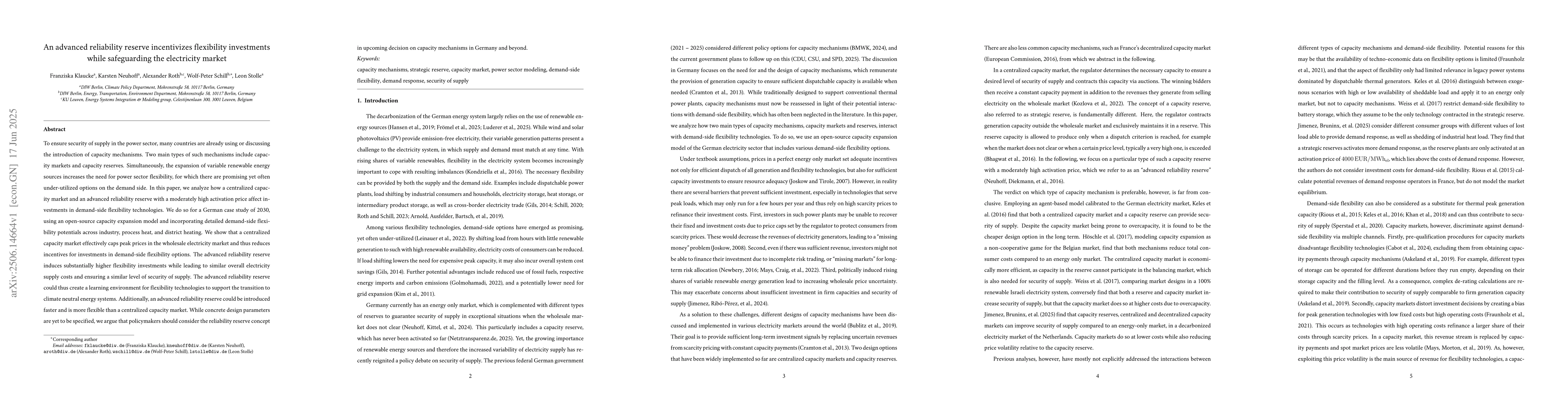 To ensure security of supply in the power sector, many countries are already using or discussing the introduction of capacity mechanisms. Two main types of such mechanisms include capacity markets and capacity reserves. Simultaneously, the expansion of variable renewable energy sources increases the need for power sector flexibility, for which there are promising yet often under-utilized options on the demand side. In this paper, we analyze how a centralized capacity market and an advanced reliability reserve with a moderately high activation price affect investments in demand-side flexibility technologies. We do so for a German case study of 2030, using an open-source capacity expansion model and incorporating detailed demand-side flexibility potentials across industry, process heat, and district heating. We show that a centralized capacity market effectively caps peak prices in the wholesale electricity market and thus reduces incentives for investments in demand-side flexibility options. The advanced reliability reserve induces substantially higher flexibility investments while leading to similar overall electricity supply costs and ensuring a similar level of security of supply. The advanced reliability reserve could thus create a learning environment for flexibility technologies to support the transition to climate neutral energy systems. Additionally, an advanced reliability reserve could be introduced faster and is more flexible than a centralized capacity market. While concrete design parameters are yet to be specified, we argue that policymakers should consider the reliability reserve concept in upcoming decision on capacity mechanisms in Germany and beyond.