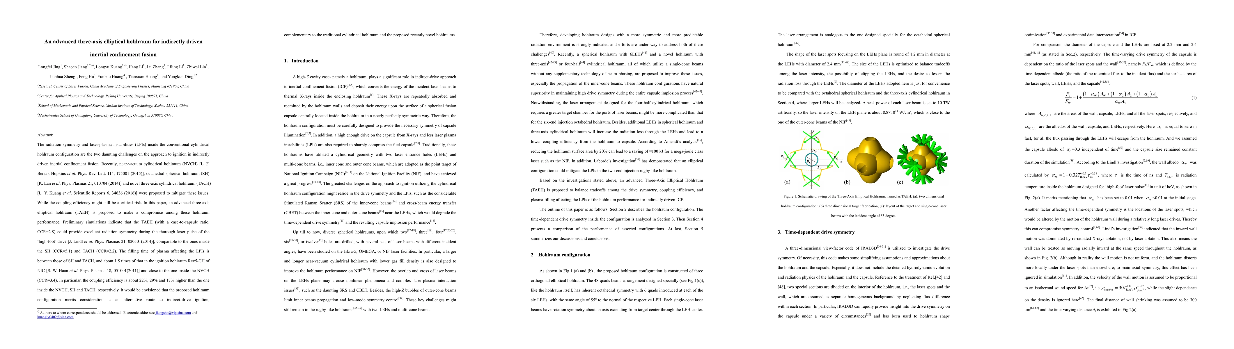 This paper proposes an advanced three-axis elliptical hohlraum (TAEH) to address radiation symmetry and laser-plasma instabilities in inertial confinement fusion. Preliminary simulations suggest that TAEH offers improved radiation symmetry and coupling efficiency compared to conventional and recently proposed hohlraum configurations, positioning it as a potential alternative for indirect-drive ignition.