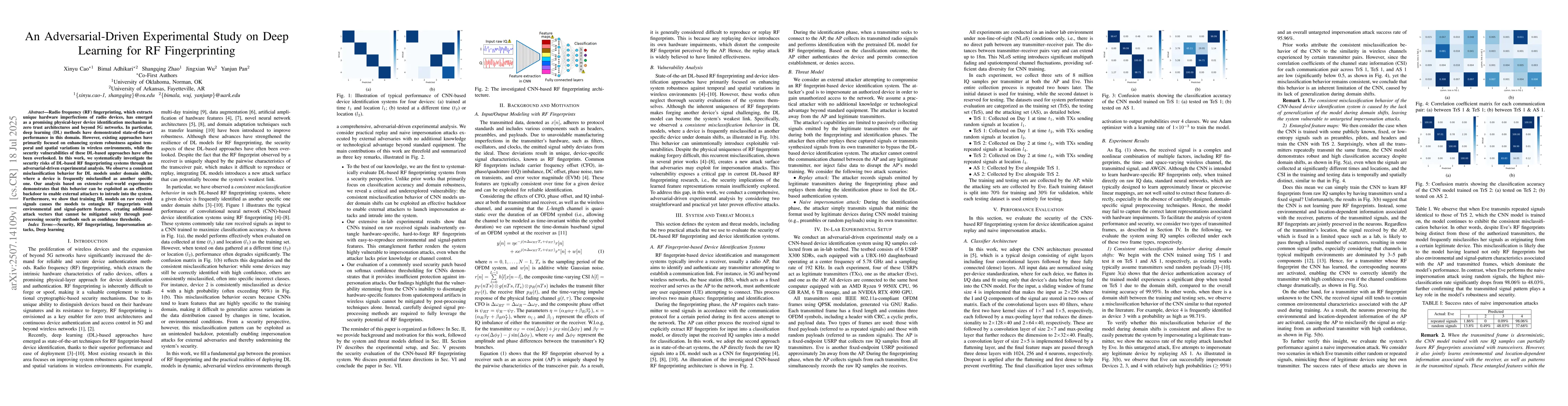 Radio frequency (RF) fingerprinting, which extracts unique hardware imperfections of radio devices, has emerged as a promising physical-layer device identification mechanism in zero trust architectures and beyond 5G networks. In particular, deep learning (DL) methods have demonstrated state-of-the-art performance in this domain. However, existing approaches have primarily focused on enhancing system robustness against temporal and spatial variations in wireless environments, while the security vulnerabilities of these DL-based approaches have often been overlooked. In this work, we systematically investigate the security risks of DL-based RF fingerprinting systems through an adversarial-driven experimental analysis. We observe a consistent misclassification behavior for DL models under domain shifts, where a device is frequently misclassified as another specific one. Our analysis based on extensive real-world experiments demonstrates that this behavior can be exploited as an effective backdoor to enable external attackers to intrude into the system. Furthermore, we show that training DL models on raw received signals causes the models to entangle RF fingerprints with environmental and signal-pattern features, creating additional attack vectors that cannot be mitigated solely through post-processing security methods such as confidence thresholds.