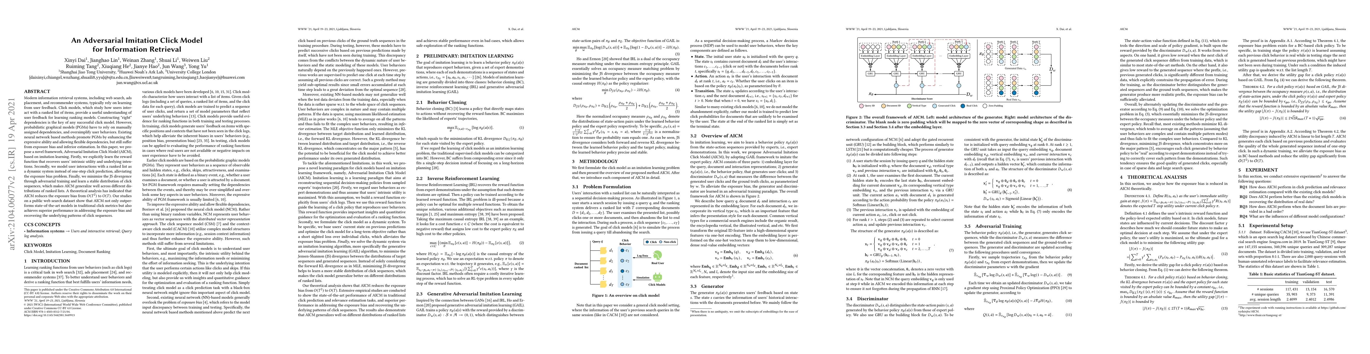 This paper introduces the Adversarial Imitation Click Model (AICM) to improve information retrieval systems by learning user interactions with ranked lists. AICM addresses exposure bias through adversarial training, dynamic modeling of user interactions, and a reward function that captures intrinsic user utility, leading to better generalization and performance over existing models.