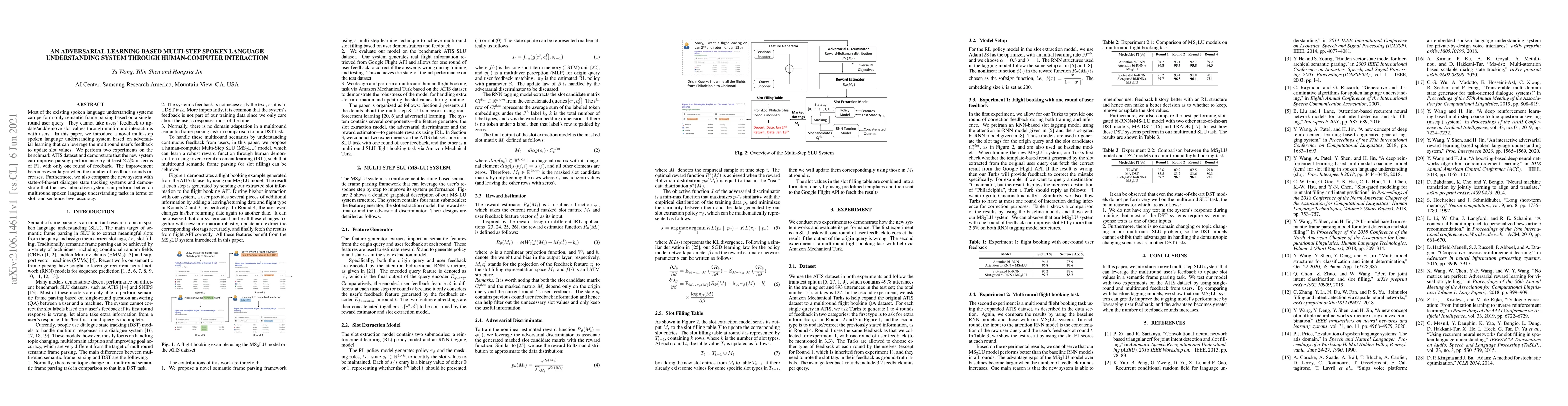 This paper proposes a multi-step spoken language understanding system using adversarial learning that enhances performance through multiround user feedback. Experiments on the ATIS dataset show a $2.5\%$ F1 score improvement with one round of feedback, with further gains as more feedback is provided.