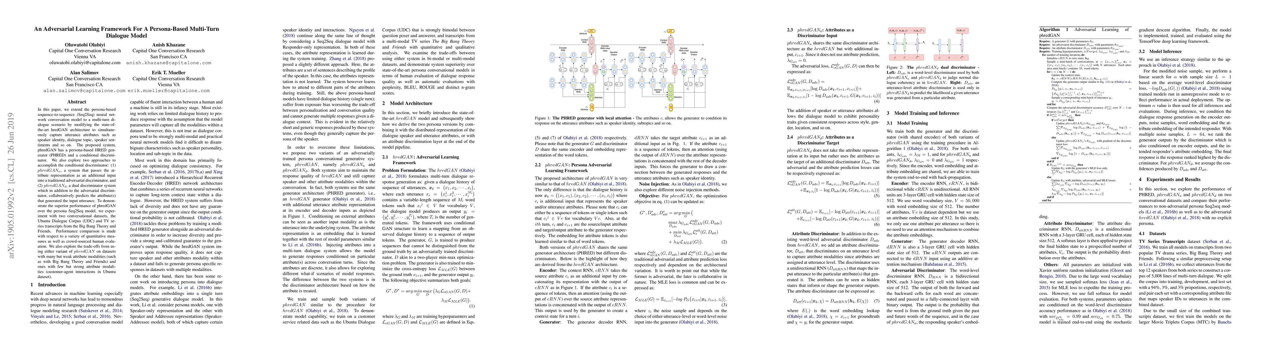 This paper proposes phredGAN, an adversarial learning framework for a persona-based multi-turn dialogue model, enhancing the hredGAN architecture to capture attributes like speaker identity and sentiment. It introduces two variants, phredGAN_a and phredGAN_d, and demonstrates superior performance over traditional models using quantitative and human evaluations on Ubuntu Dialogue Corpus and TV series transcripts.