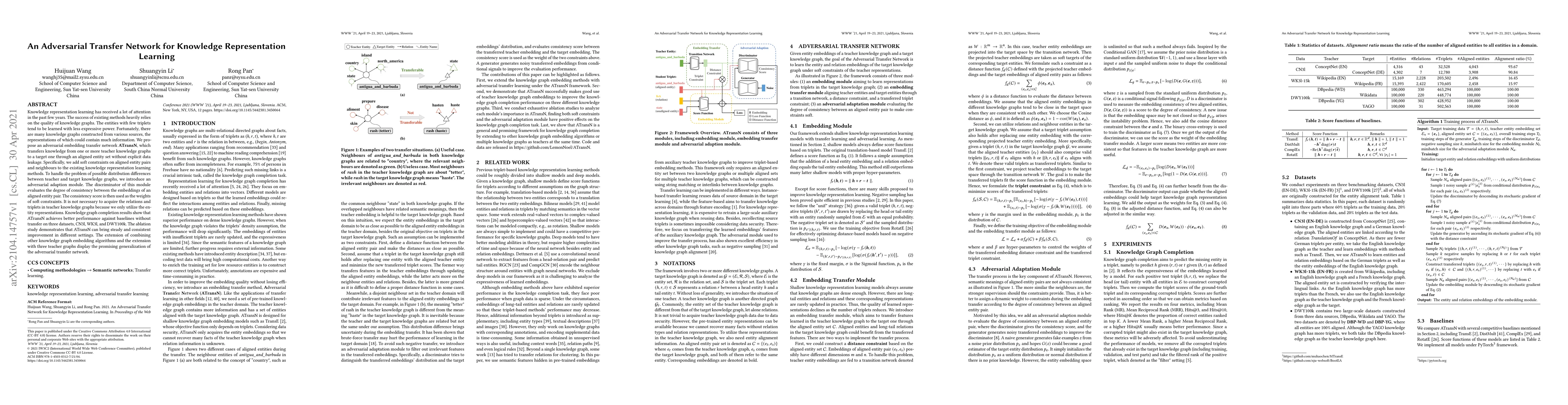 The paper proposes ATransN, an adversarial transfer network that transfers knowledge from teacher knowledge graphs to a target graph to enhance representation learning, especially for entities with few triplets. It uses an adversarial adaptation module to handle distribution differences and achieves better knowledge graph completion performance on three datasets.