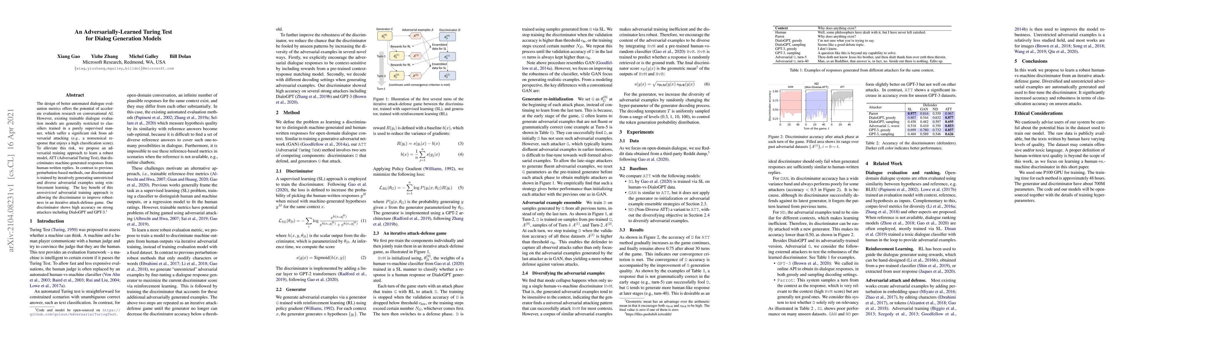 This paper proposes an adversarially-trained Turing Test (ATT) model to evaluate dialogue generation systems, aiming to improve robustness against adversarial attacks. Unlike traditional supervised methods, ATT uses reinforcement learning to iteratively generate diverse adversarial examples, enhancing the discriminator's ability to distinguish machine-generated from human responses.