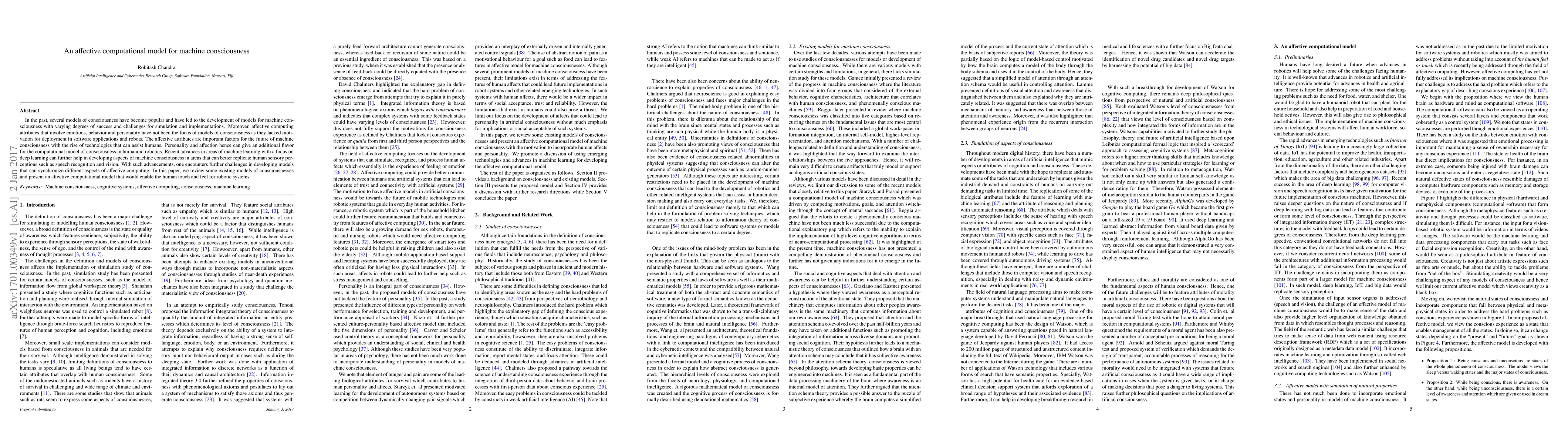 This paper reviews existing models of machine consciousness and proposes an affective computational model incorporating emotions, behavior, and personality to enhance humanoid robotics, leveraging advances in deep learning for better human-like sensory perception. The model aims to synchronize affective computing aspects to provide a more human touch in robotic systems.