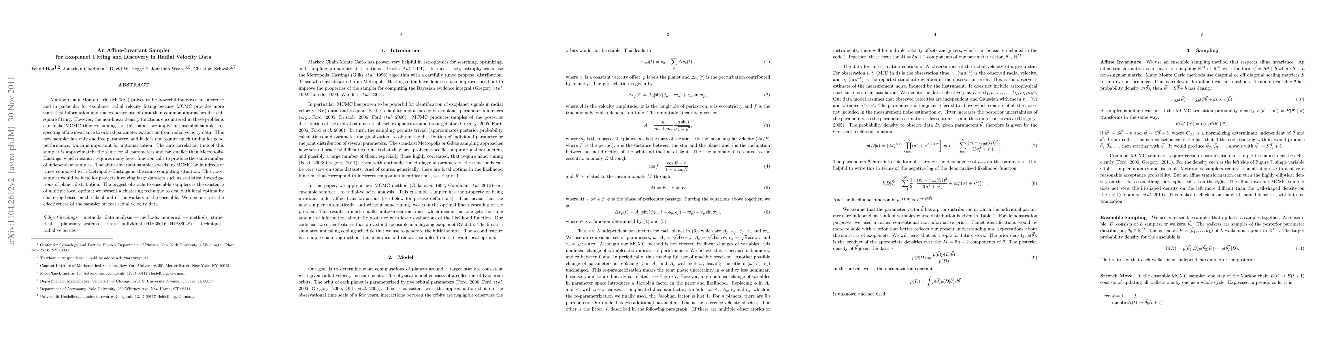 This paper introduces an affine-invariant ensemble sampler for efficient Bayesian inference in exoplanet radial velocity fitting, significantly speeding up Markov Chain Monte Carlo (MCMC) processes compared to traditional methods. The new sampler effectively handles multiple local optima using a clustering technique, demonstrating improved performance on real data.